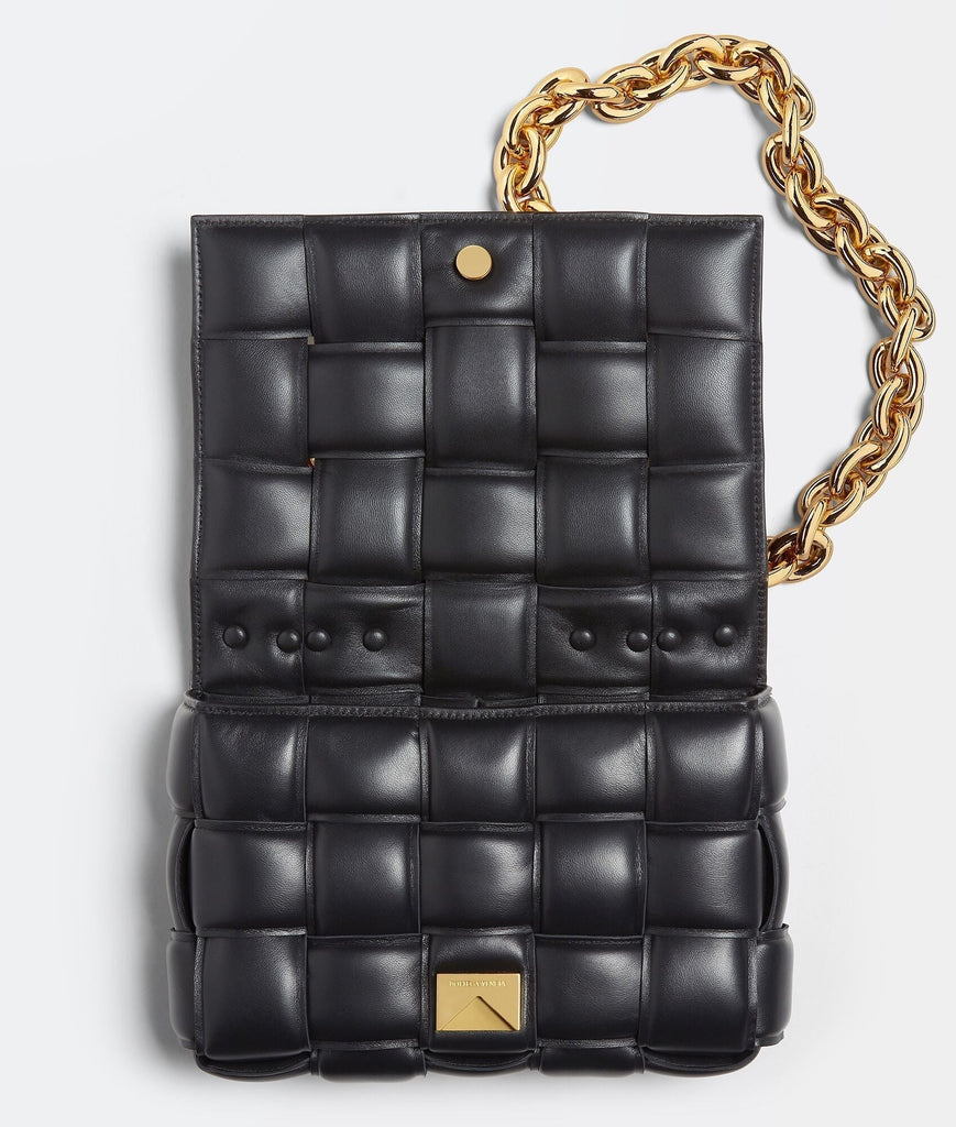 • Padded intrecciato leather crossbody bag• One interior zipped pocket• Metal closure  Material: 100% Lambskin Lining: Bonded lambskinColor: Black Availability date: 01/10/2024Hardware: Gold finishHeight: 18 cmWidth: 26 cmDepth: 8 cmHandle drop: 13 cmStrap drop: 45...