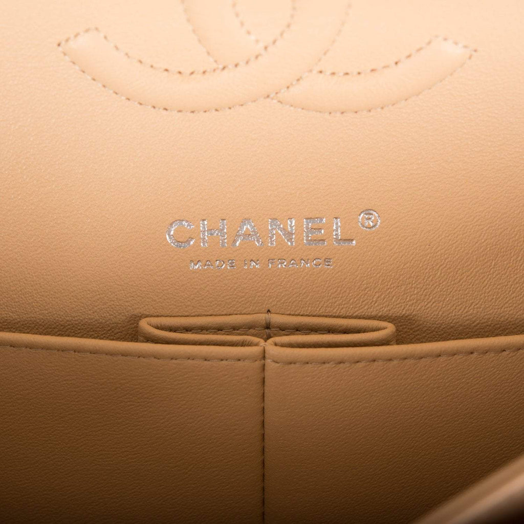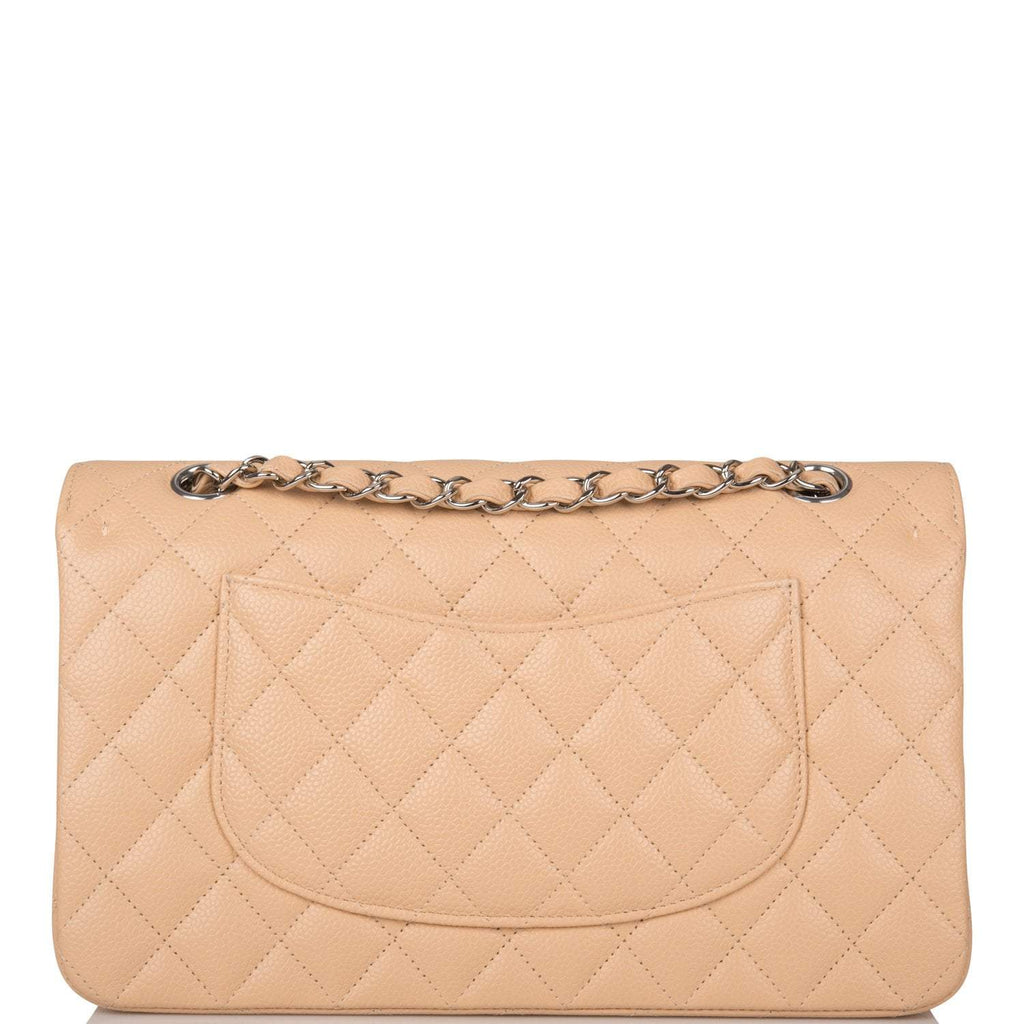 This Medium Classic Double Flap bag is in beige caviar leather with silver tone hardware and features a front flap with signature CC turnlock closure, half moon back pocket, and adjustable interwoven silver tone chain...