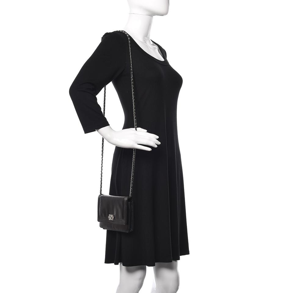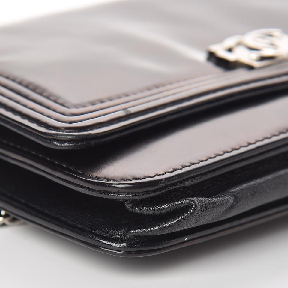 DESCRIPTION We guarantee this is an authentic CHANEL Glazed Calfskin Boy Wallet On Chain WOC Black or 100% of your money back. This chic wallet on chain is crafted of smooth luxurious glazed calfskin leather...