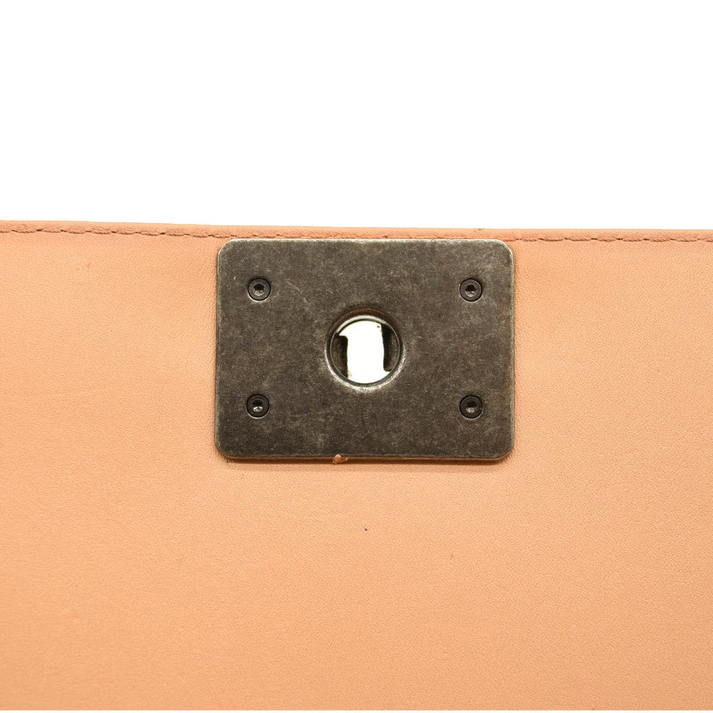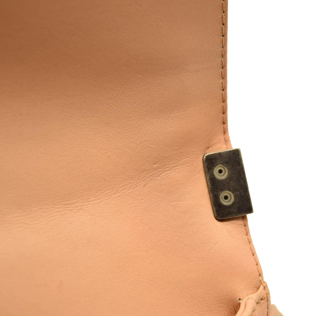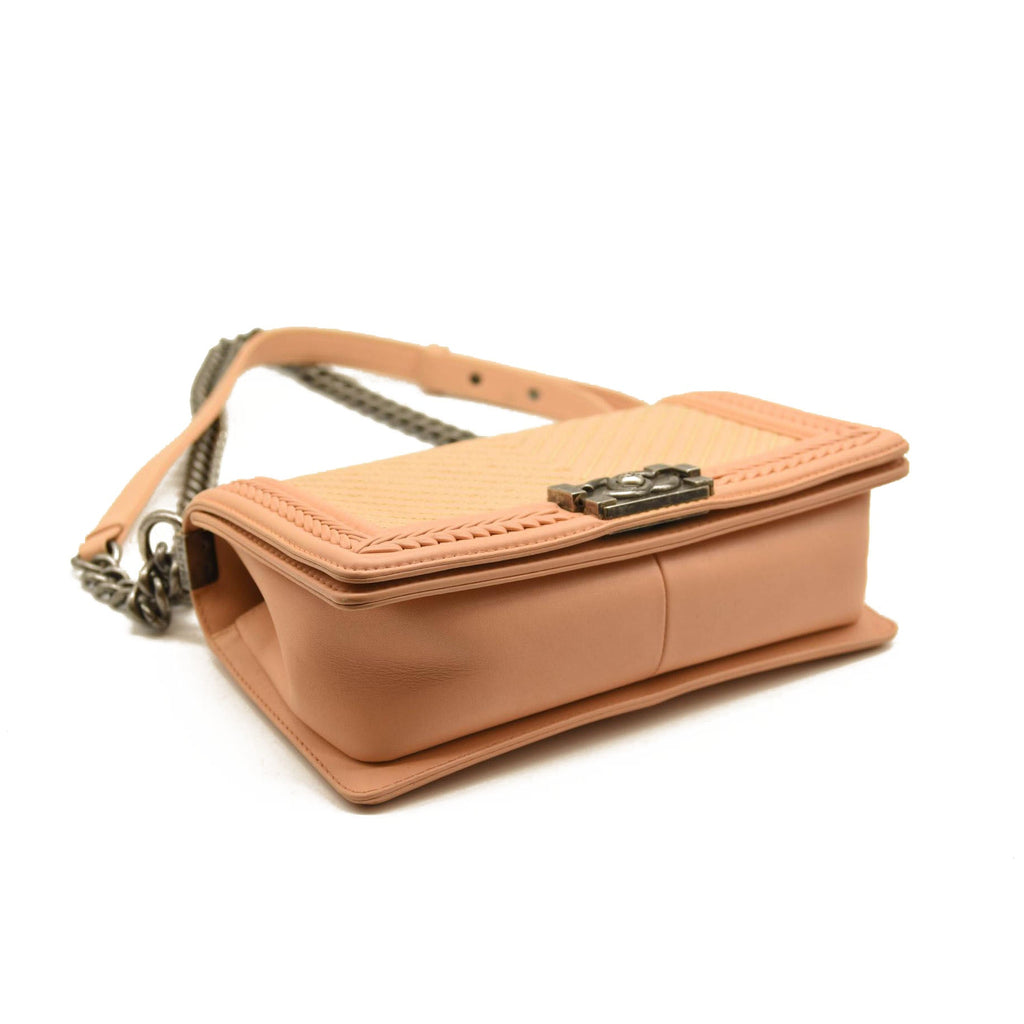 This is an authentic CHANEL Calfskin Braided Chevron Medium Boy Flap in Beige. This chic shoulder bag features stitched chevron calfskin leather in beige with a frame of linear quilting with braided accents. The bag features an aged silver chain link and shoulder pad shoulder strap with an aged silver facing Chanel CC push lock on the full facing flap. The flap opens to a matching fabric interior with a patch pocket.