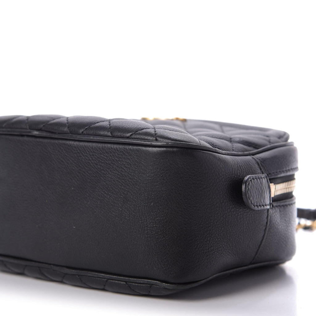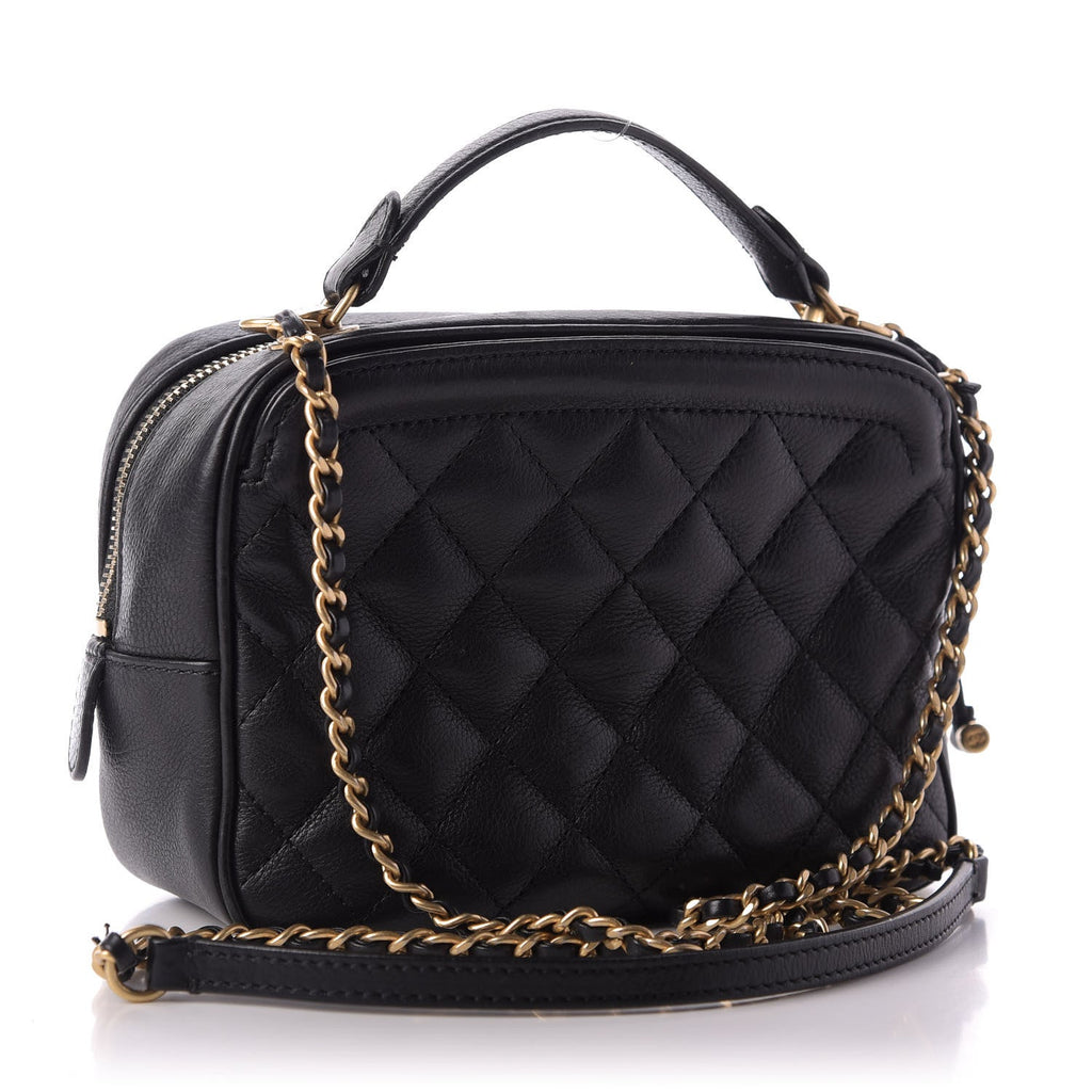 This is an authentic CHANEL Calfskin Quilted CC Small Vanity Case in Black. This chic shoulder bag is finely crafted of luxurious grained calfskin leather in black. The bag features a leather-threaded an aged gold-tone chain shoulder strap and a Chanel CC logo on the front. The top zippers open to a black fabric interior with zipper and patch pockets.