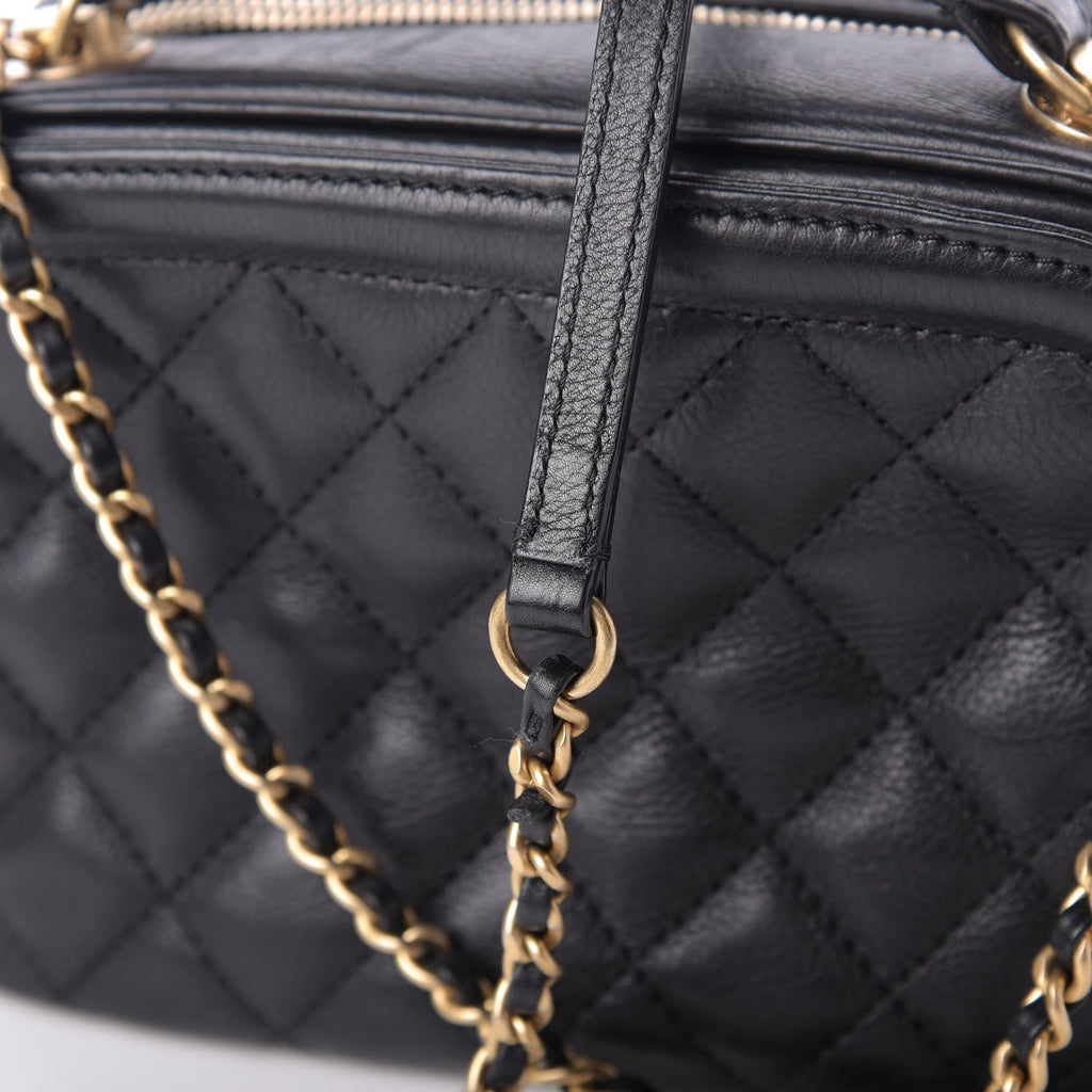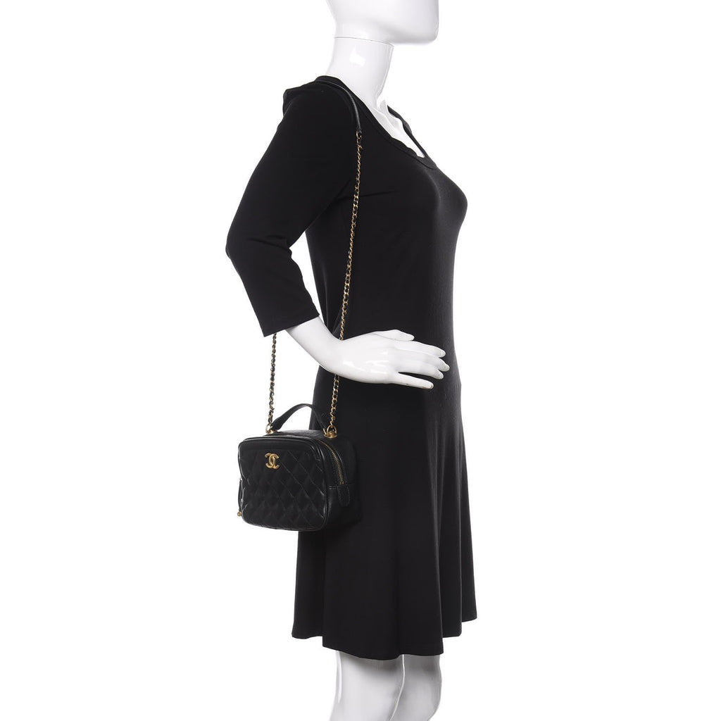 DescriptionSize Base length: 7.25 in Height: 5.60 in Width: 3.00 in Drop: 1.50 in Drop: 21.00 in This is an authentic CHANEL Calfskin Quilted CC Small Vanity Case in Black. This chic shoulder bag is...
