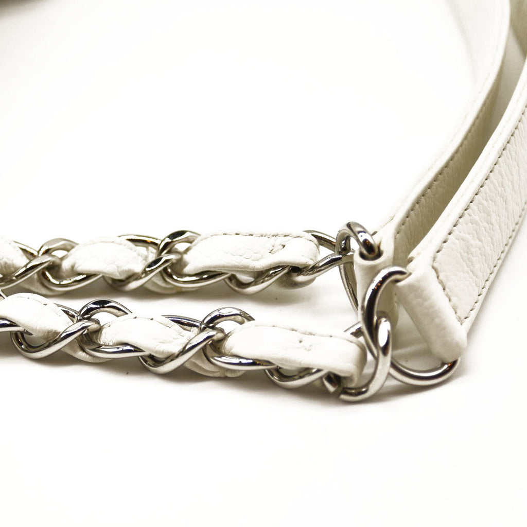 This is an authentic CHANEL Caviar Grand Shopping Tote GST White. This stunning tote is beautifully crafted of luxurious diamond quilted white caviar leather. The bag features shoulder straps with silver chain links threaded with leather and leather shoulder pads as well as a prominent frontal patch Chanel CC logo and a rear pocket. The top zipper opens to a white fabric interior with zipper and patch pockets. This is a marvelous tote that is ideal for day from Chanel!