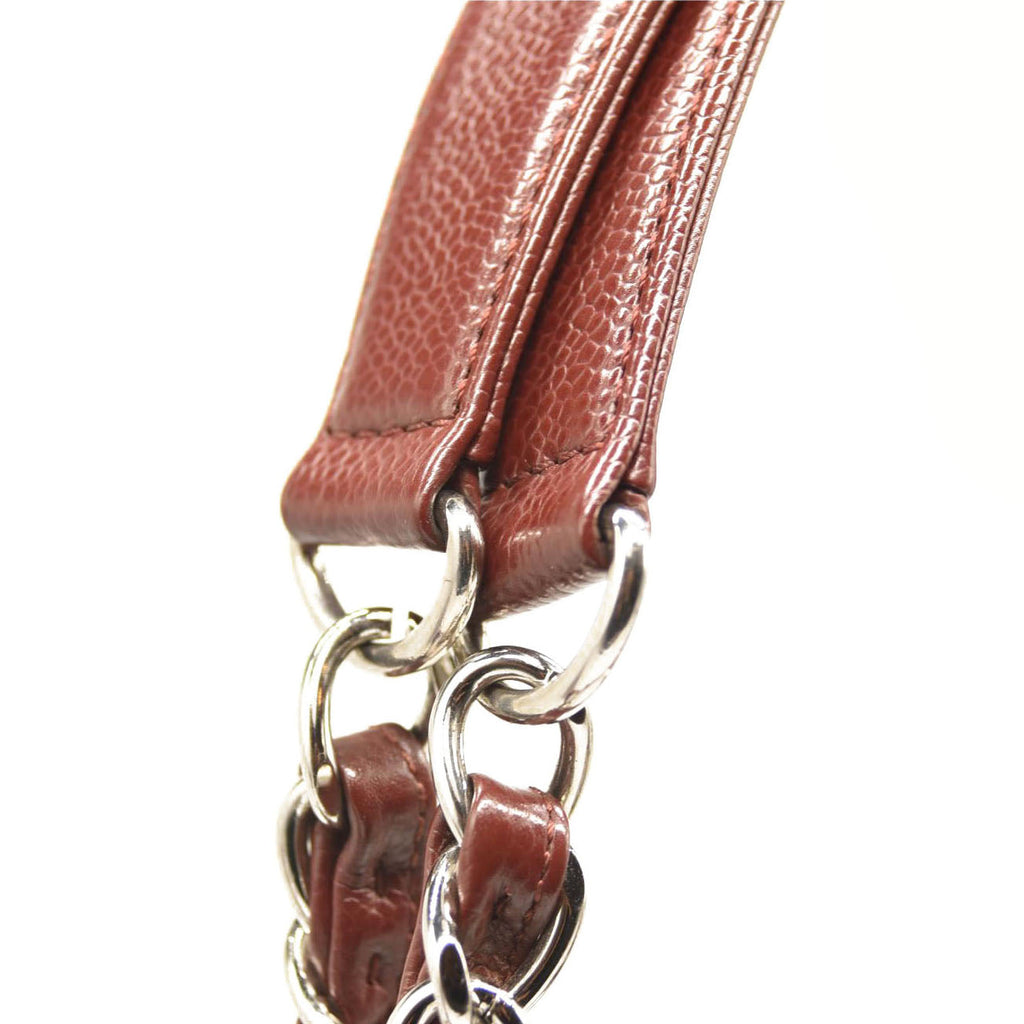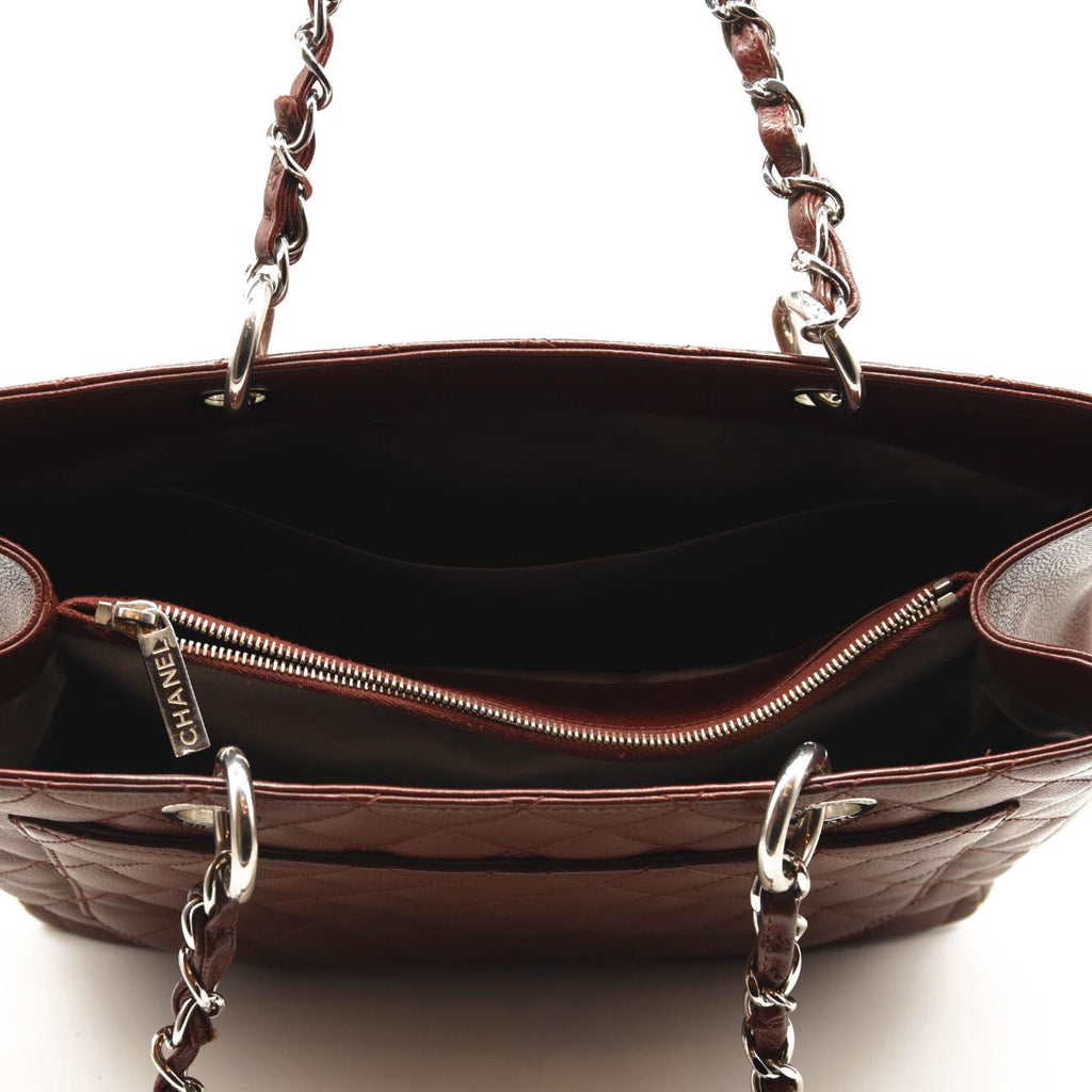 This is an authentic CHANEL Caviar Quilted Grand Shopping Tote GST in Burgundy. This stylish tote is crafted of luxurious diamond-quilted Burgundy caviar leather. The bag features leather-threaded polished silver chain link shoulder straps with leather shoulder pads, a prominent quilted Chanel CC logo, and a wide rear patch pocket. The top is open to a partitioned gray satin interior with a full zipper compartment in the center and large open pockets on either side. This is a fabulous tote that is ideal for day wear from Chanel!
