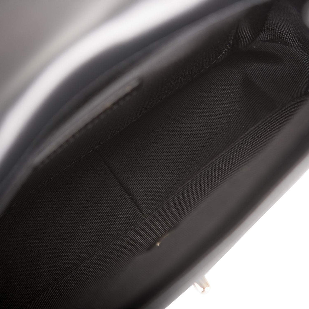 This Small Entwined Chain Flap bag is in black lambskin leather with light gold tone hardware and features a front flap with signature CC turnlock closure, white leather detailing, and adjustable interwoven light gold tone chain link and white leather shoulder strap.