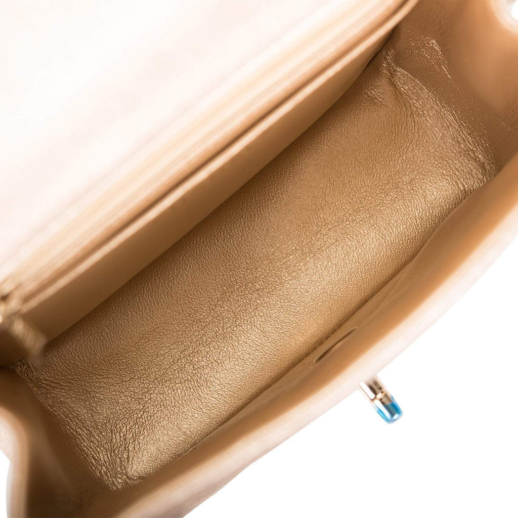 This Mini Square flap bag is in gold metallic lambskin with light gold tone hardware and has a front flap with signature CC turnlock closure, rear half moon pocket and single interwoven gold leather and light gold tone chain link shoulder/crossbody strap.