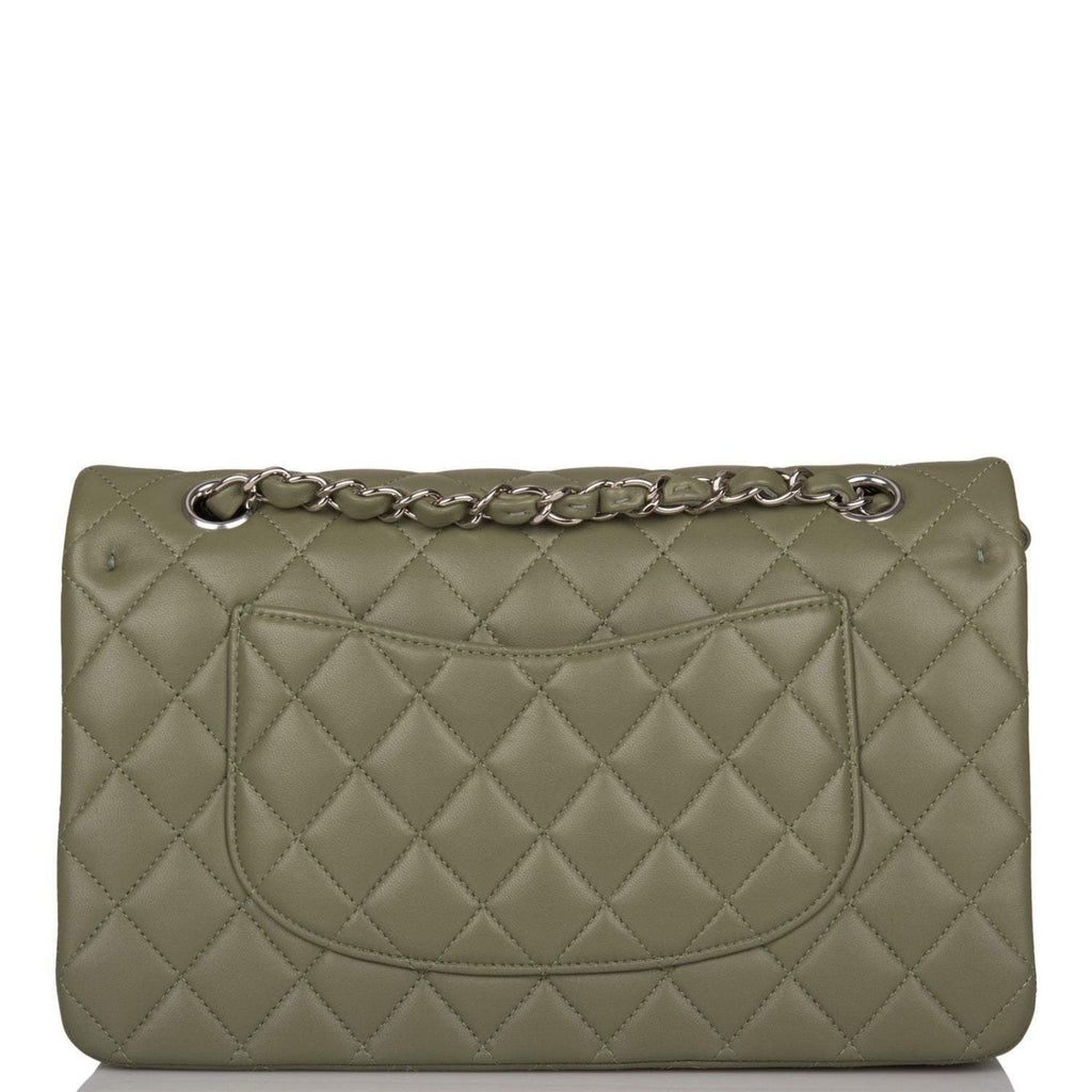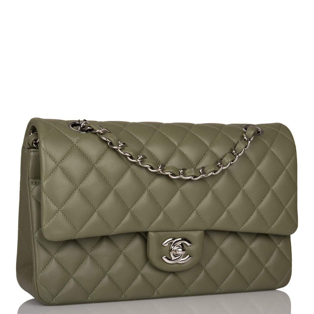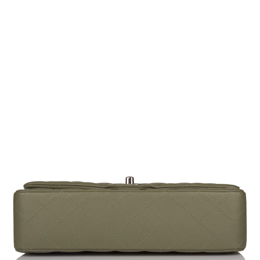 This Medium Classic Double Flap bag is in green lambskin leather with silver tone hardware and features a front flap with signature CC turnlock closure, half moon back pocket, and adjustable interwoven silver tone chain...