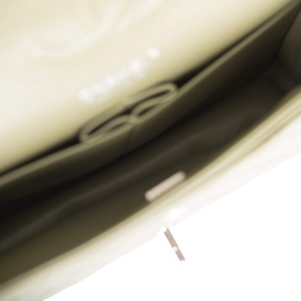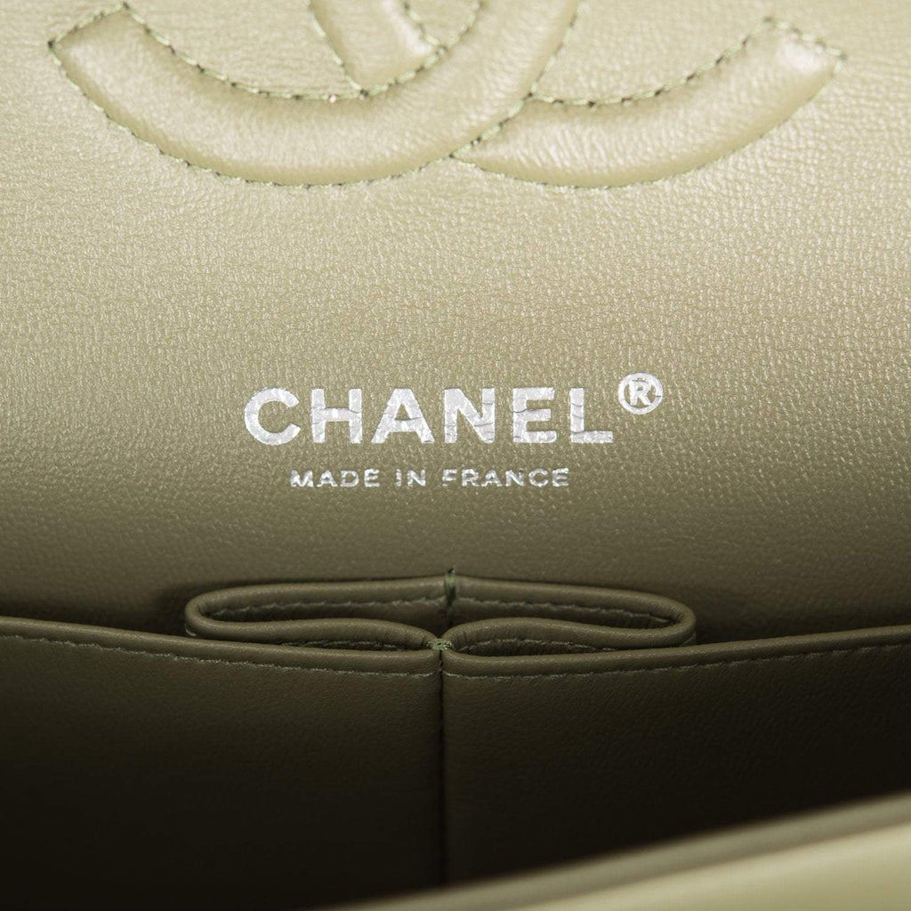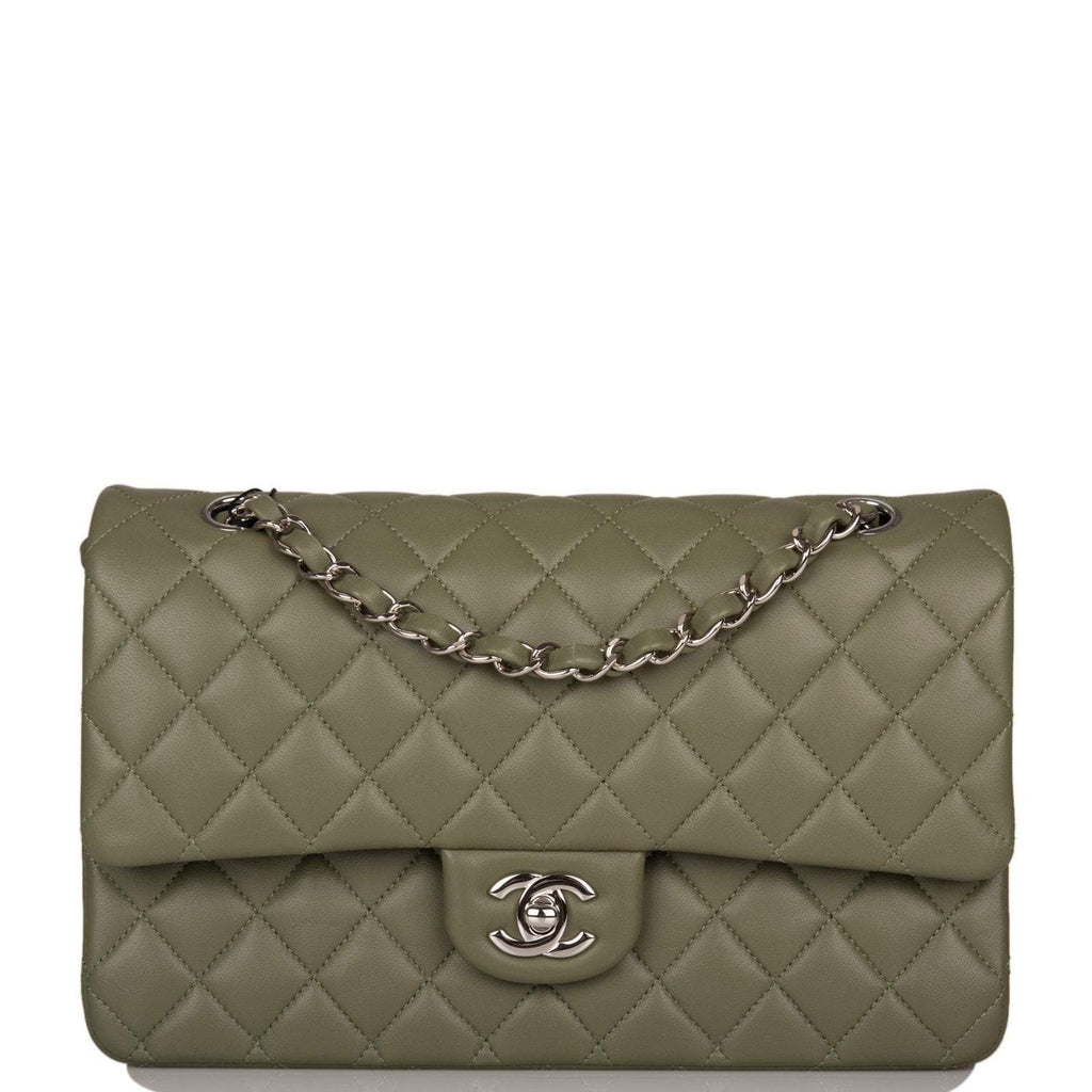 This Medium Classic Double Flap bag is in green lambskin leather with silver tone hardware and features a front flap with signature CC turnlock closure, half moon back pocket, and adjustable interwoven silver tone chain...