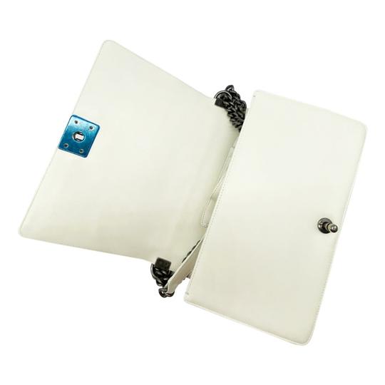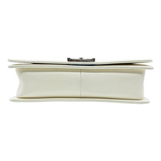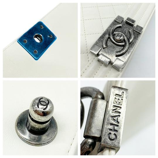 We guarantee this is an authentic CHANEL Lambskin Quilted New Medium Boy Flap White or 100% of your money back. This chic shoulder bag is crafted of diamond quilted luxurious lambskin leather in white with a linear quilted border. The bag features a ruthenium chain link shoulder strap with a leather shoulder pad and ruthenium squared Chanel CC turn lock. This opens the front flap to a fabric interior with a pocket. This is an excellent shoulder bag, ideal for day and evening use, from Chanel!