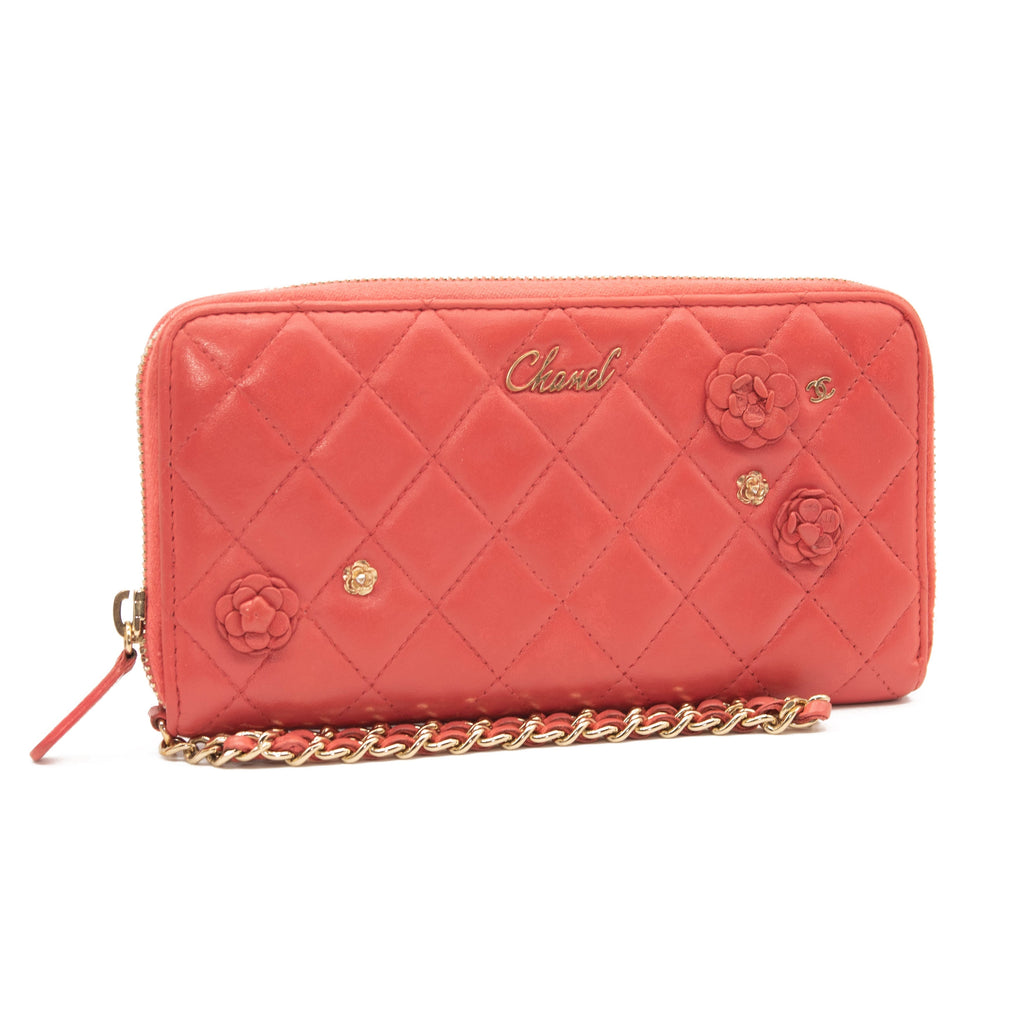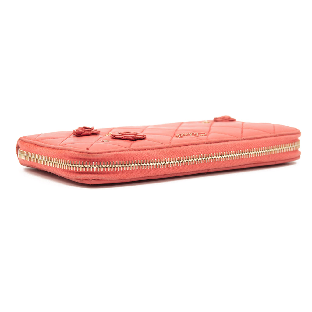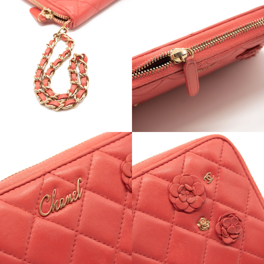 This is an authentic CHANEL Lambskin Quilted Camellia Zip Around Wristlet Wallet in Red. This sleek clutch is crafted of lambskin quilted leather in coral pink. The bag features a gold leather threaded chain wrist strap and gold Chanel logo and camellias flower details. The top zipper opens to a leather interior with card slots and an interior zipper pocket.