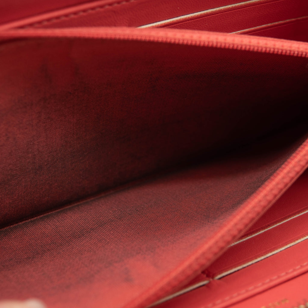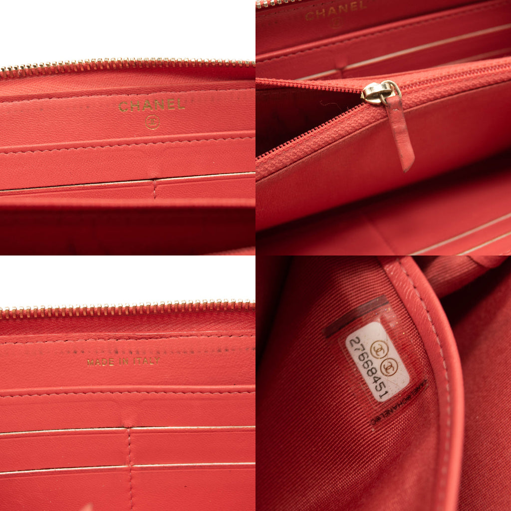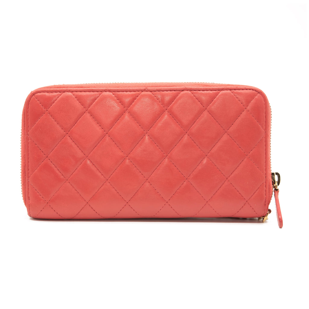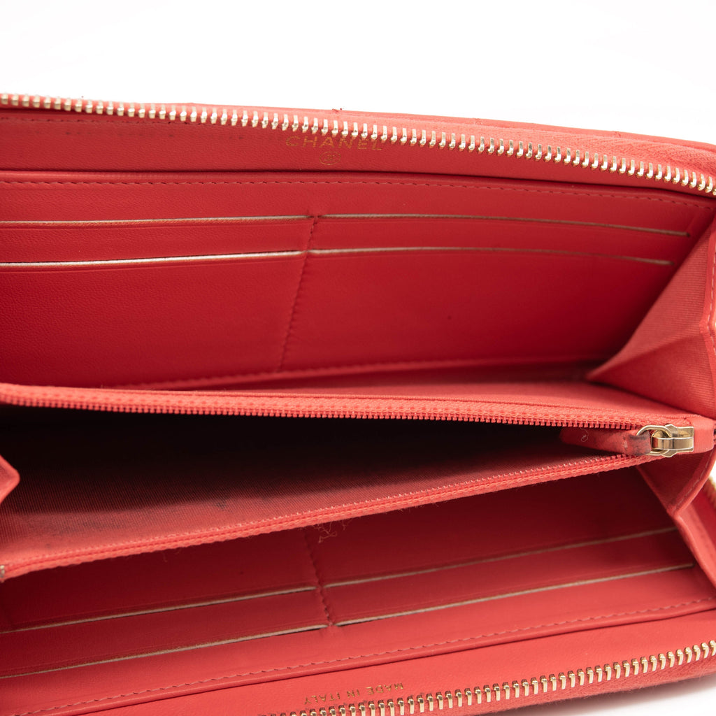 This is an authentic CHANEL Lambskin Quilted Camellia Zip Around Wristlet Wallet in Red. This sleek clutch is crafted of lambskin quilted leather in coral pink. The bag features a gold leather threaded chain wrist strap and gold Chanel logo and camellias flower details. The top zipper opens to a leather interior with card slots and an interior zipper pocket.