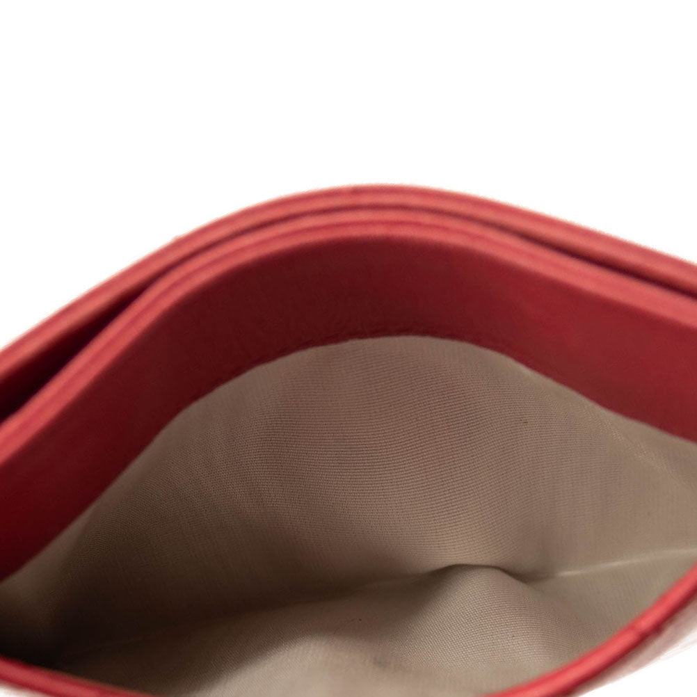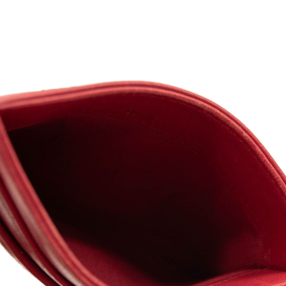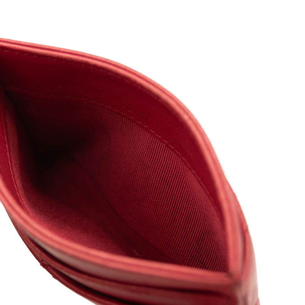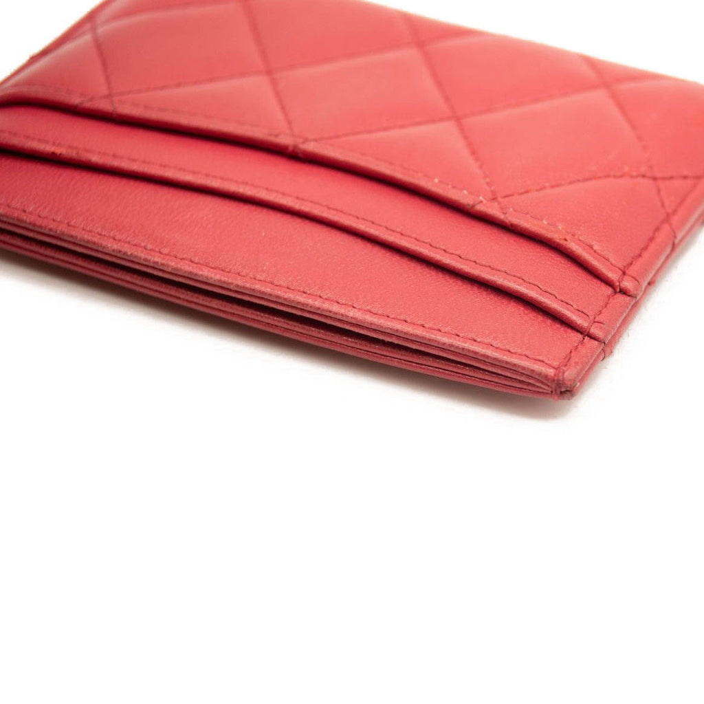 This is an authentic CHANEL Lambskin Quilted Card Holder in Red. This stylish card case is crafted of luxurious lambskin leather in red. The case features a central slot with red fabric and leather interior, three slots for cards, one on the front with a polished aged brass Chanel CC logo, two on the reverse, and a patch pocket on the top center. This is a gorgeous card case for business cards or credit cards from Chanel!