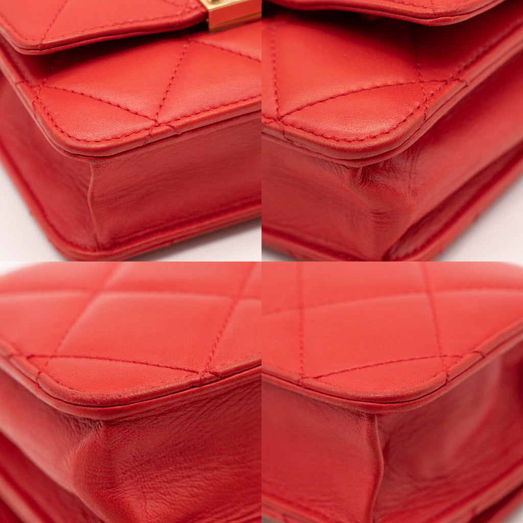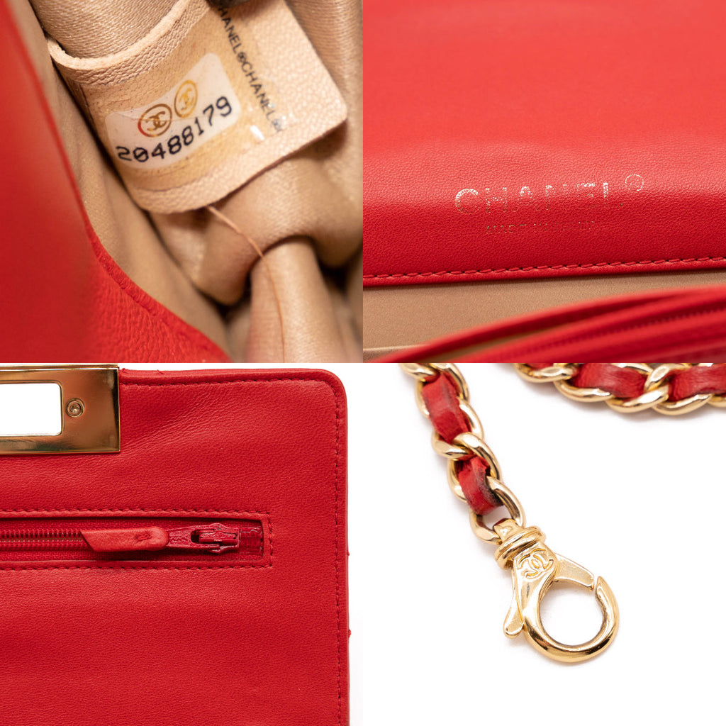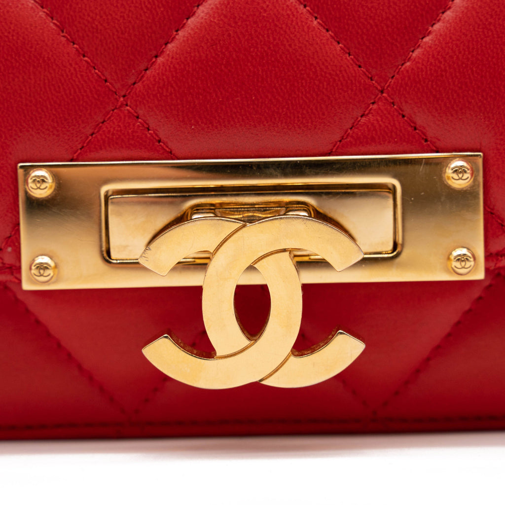 This is an authentic CHANEL Lambskin Quilted Golden Class Wallet on Chain WOC in Red. This stylish shoulder bag is crafted of diamond quilted lambskin leather in red. It features a removable leather threaded polished gold chain shoulder strap, and a flap with a gold CC clasp. The flap opens to a matching smooth leather and beige fabric interior with card slots, a flat pocket, and a zip compartment.