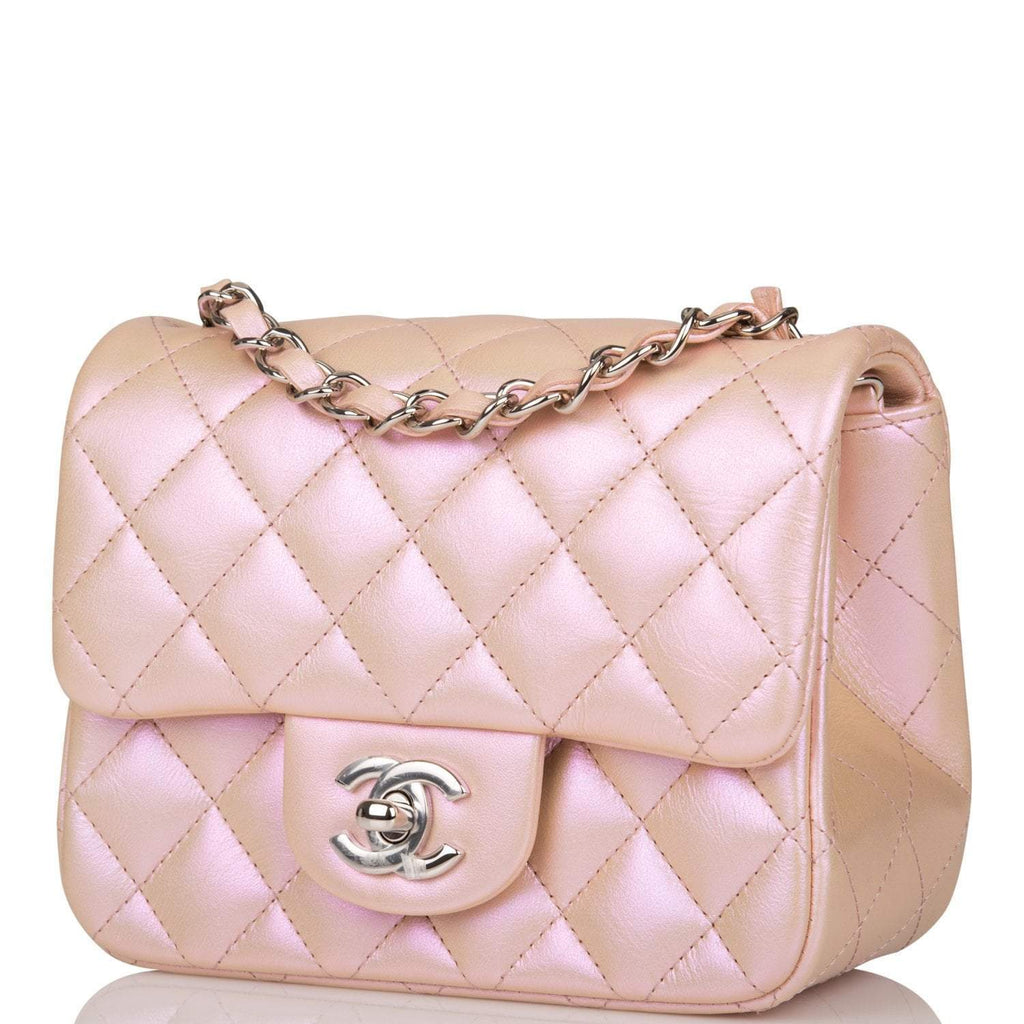 - Chanel Mini Square Flap Bag Pink Iridescent Lambskin Silver Hardware