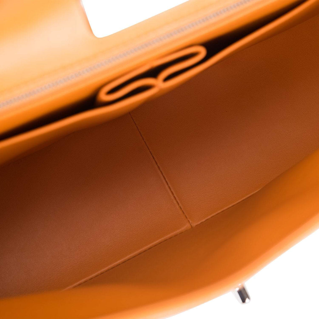The interior is lined in orange leather with a "love letter" zipper compartment under the first flap, an "outer" slit pocket is under the second flap and an interior compartment has two open pockets separated by a "lipstick" compartment.