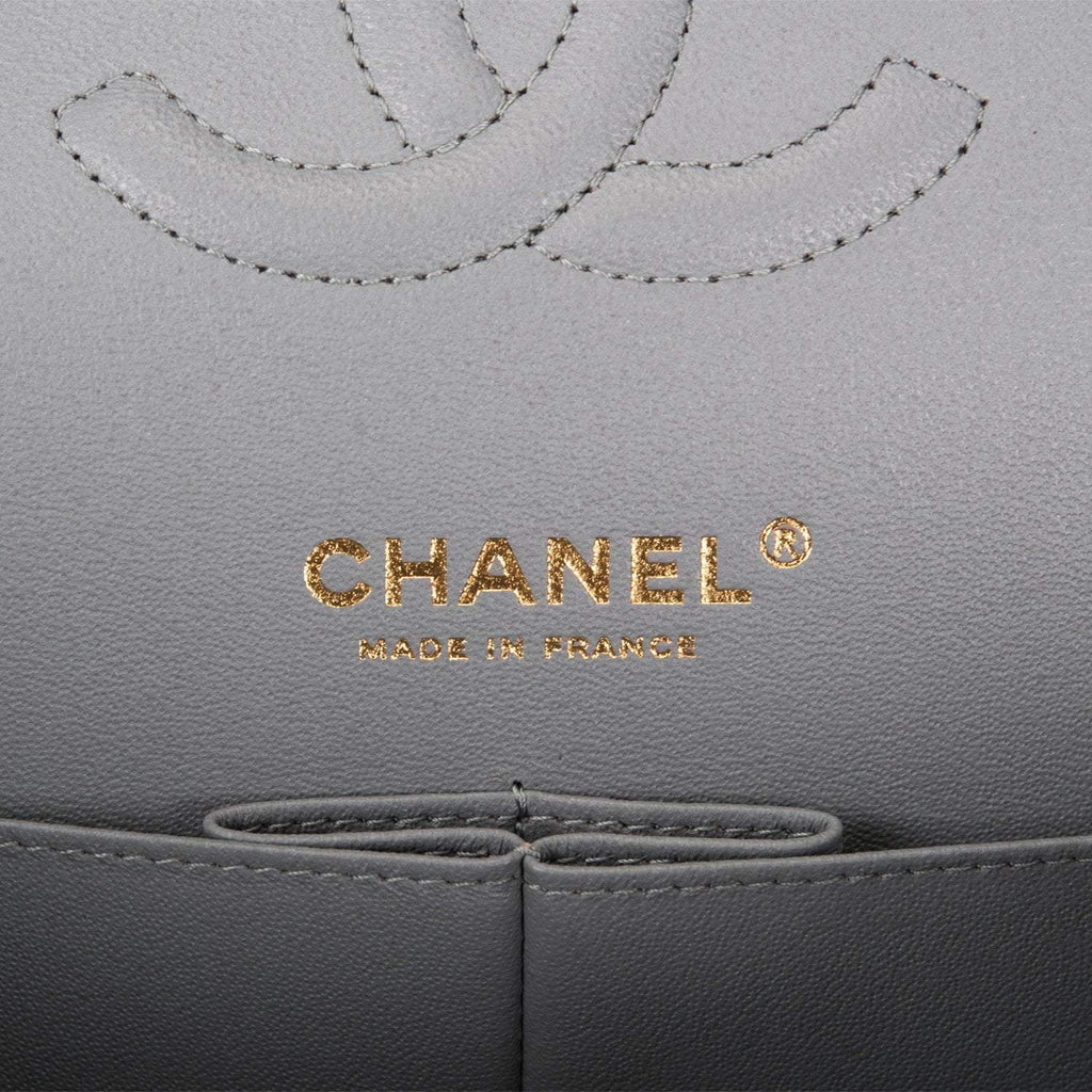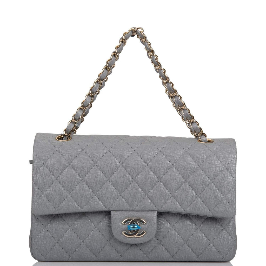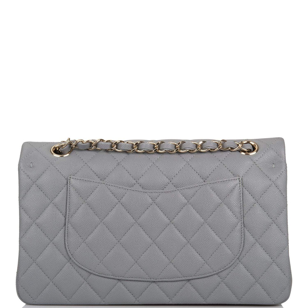 This Medium Classic Double Flap bag is in shiny grey caviar leather with light gold tone hardware and features a front flap with signature CC turnlock closure, half moon back pocket, and adjustable interwoven light gold tone chain link and grey leather shoulder strap.
