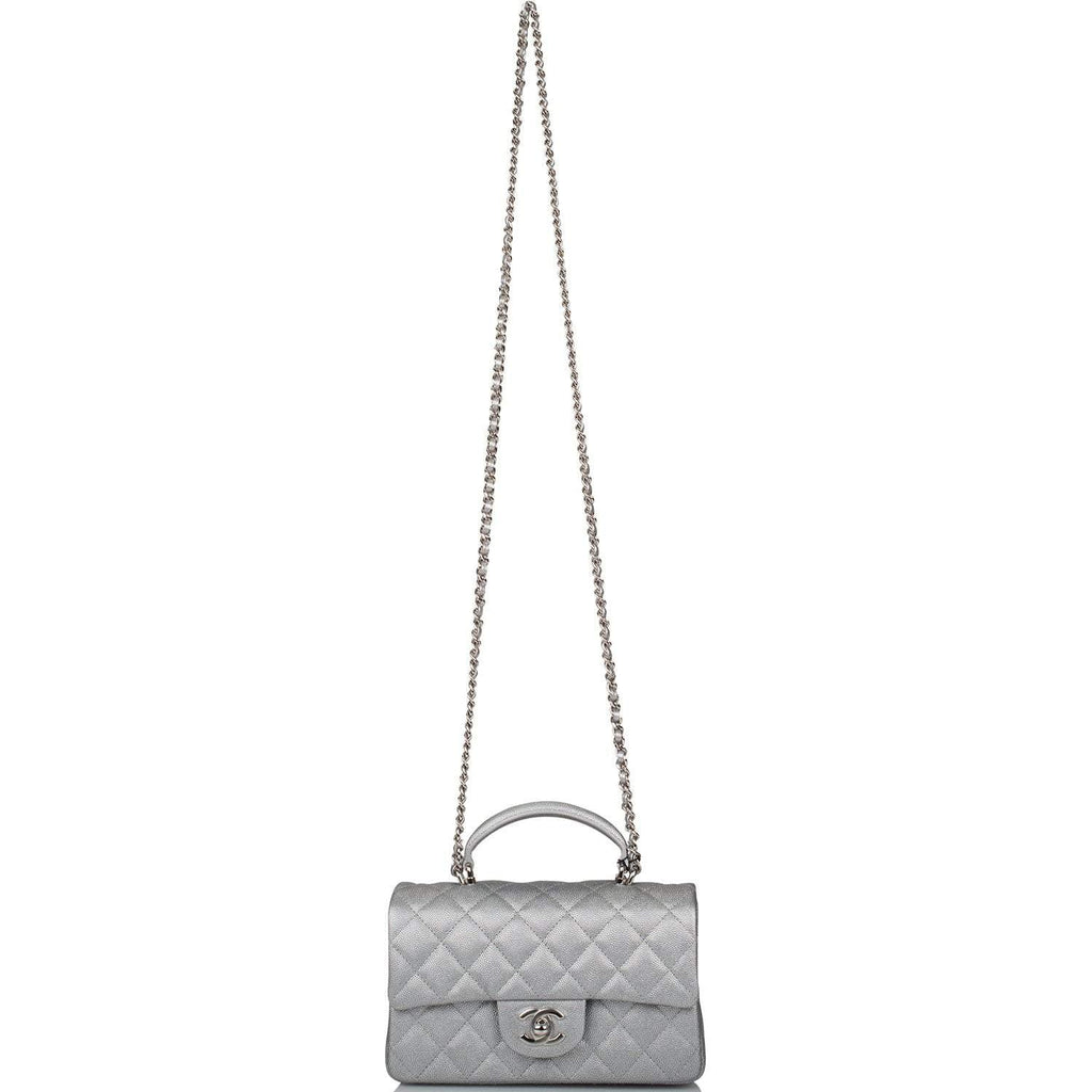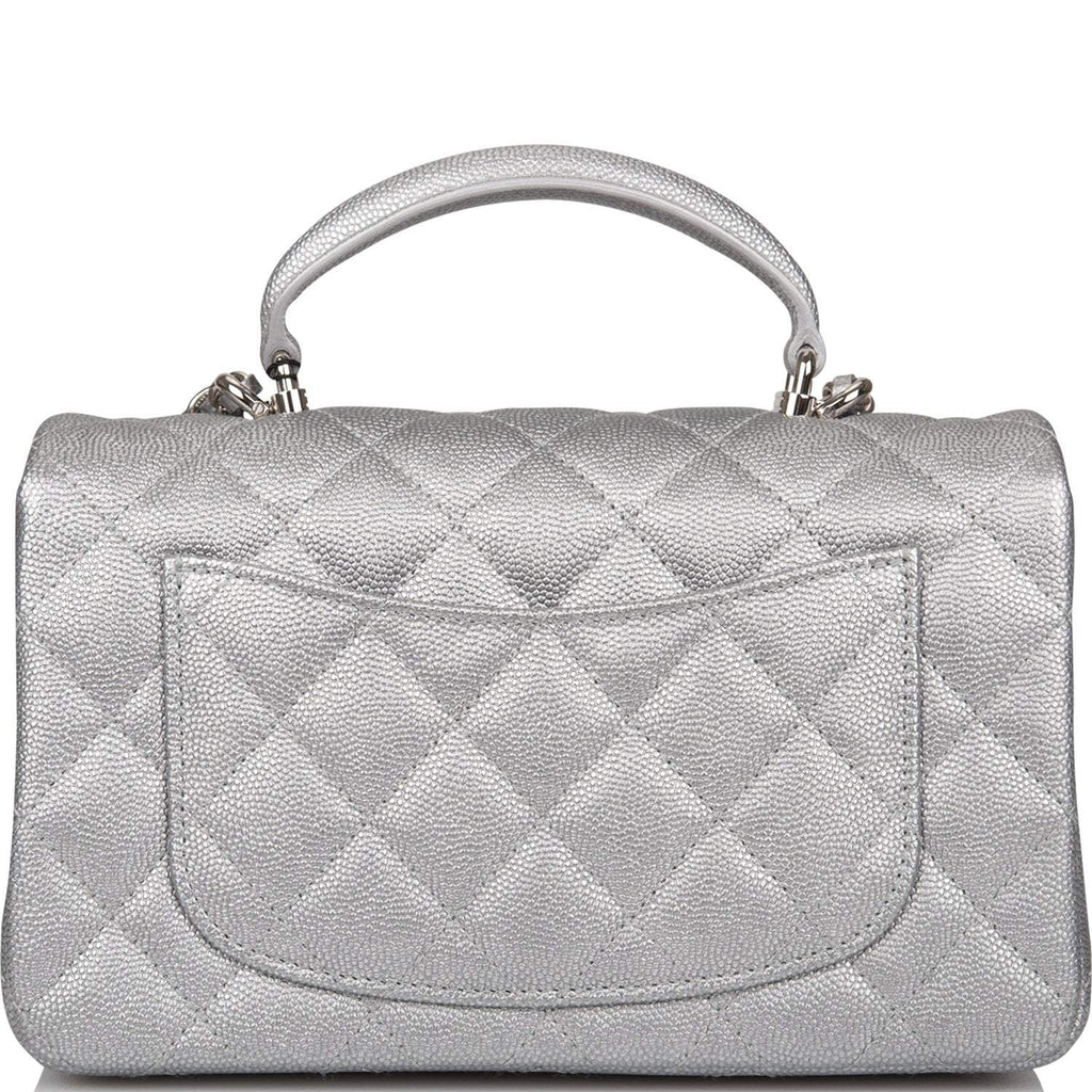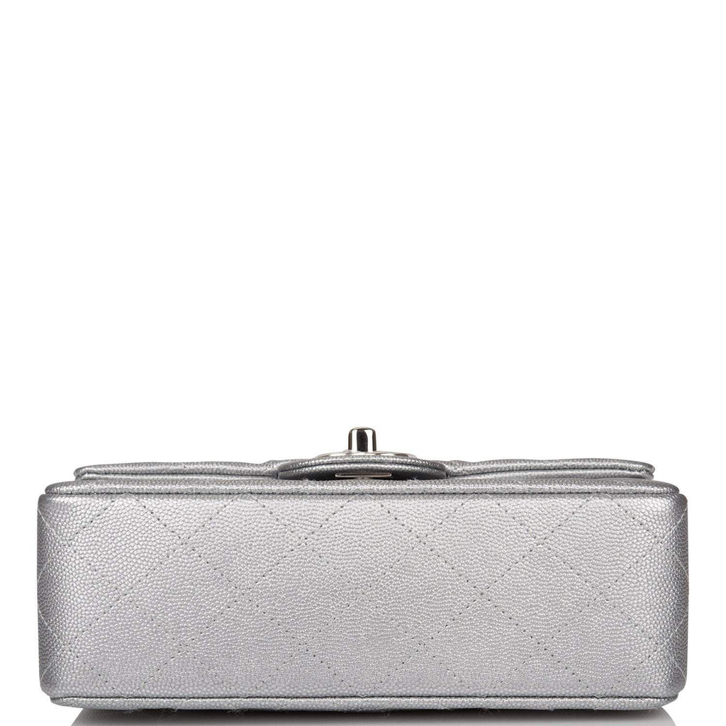 This Mini Rectangular flap bag is in silver metallic caviar with silver tone hardware and has a front flap with signature CC turnlock closure, rear half moon pocket, top handle and single interwoven silver leather and silver tone...