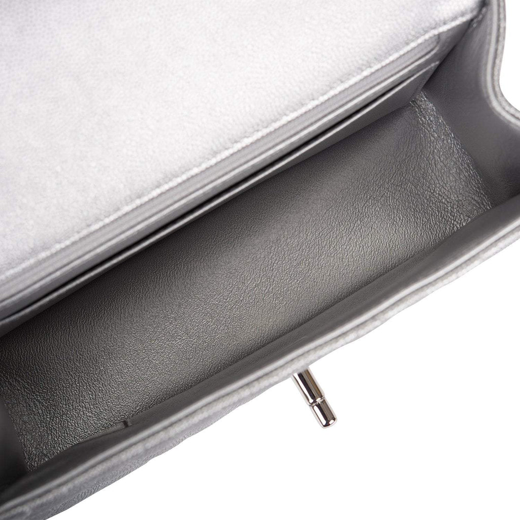 This Mini Rectangular flap bag is in silver metallic caviar with silver tone hardware and has a front flap with signature CC turnlock closure, rear half moon pocket, top handle and single interwoven silver leather and silver tone chain link shoulder/crossbody strap.