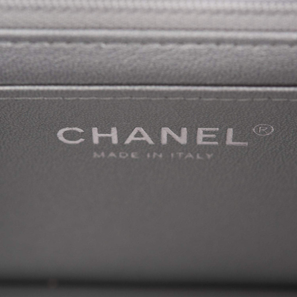 The interior is lined in silver leather and features a zipper pocket with Chanel pull and an open pocket below.