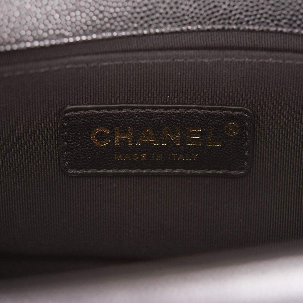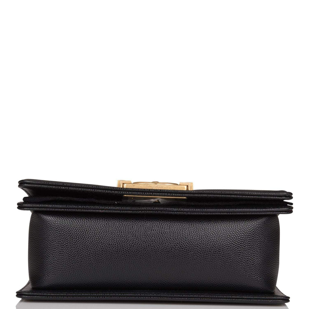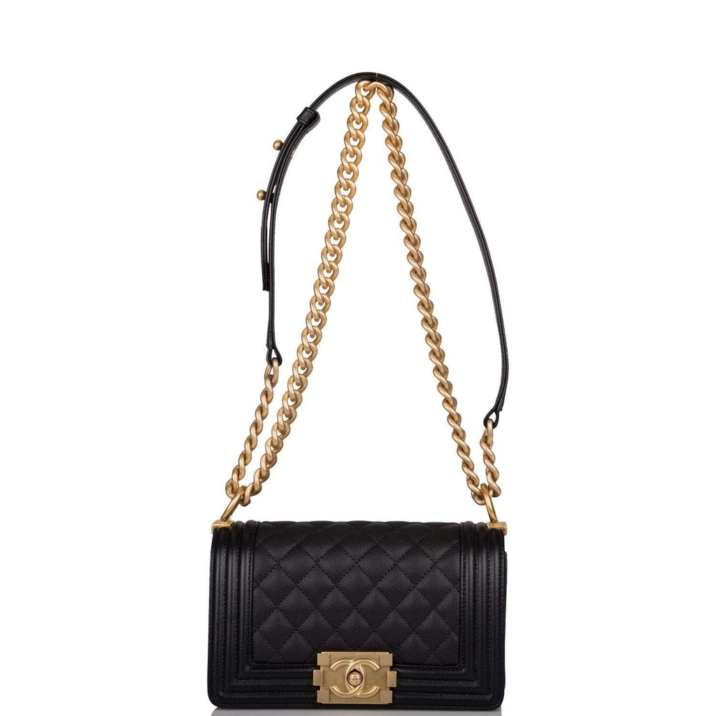 This Small Boy bag is in black quilted caviar leather with antique gold tone hardware and features a full front flap with the Le Boy CC push lock closure and an antique gold tone chain link and black leather padded shoulder/crossbody strap.