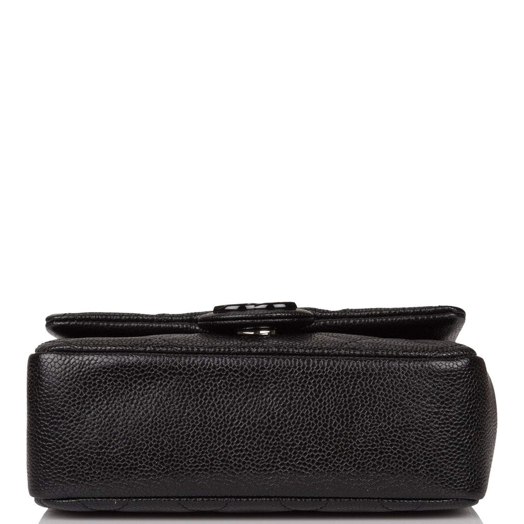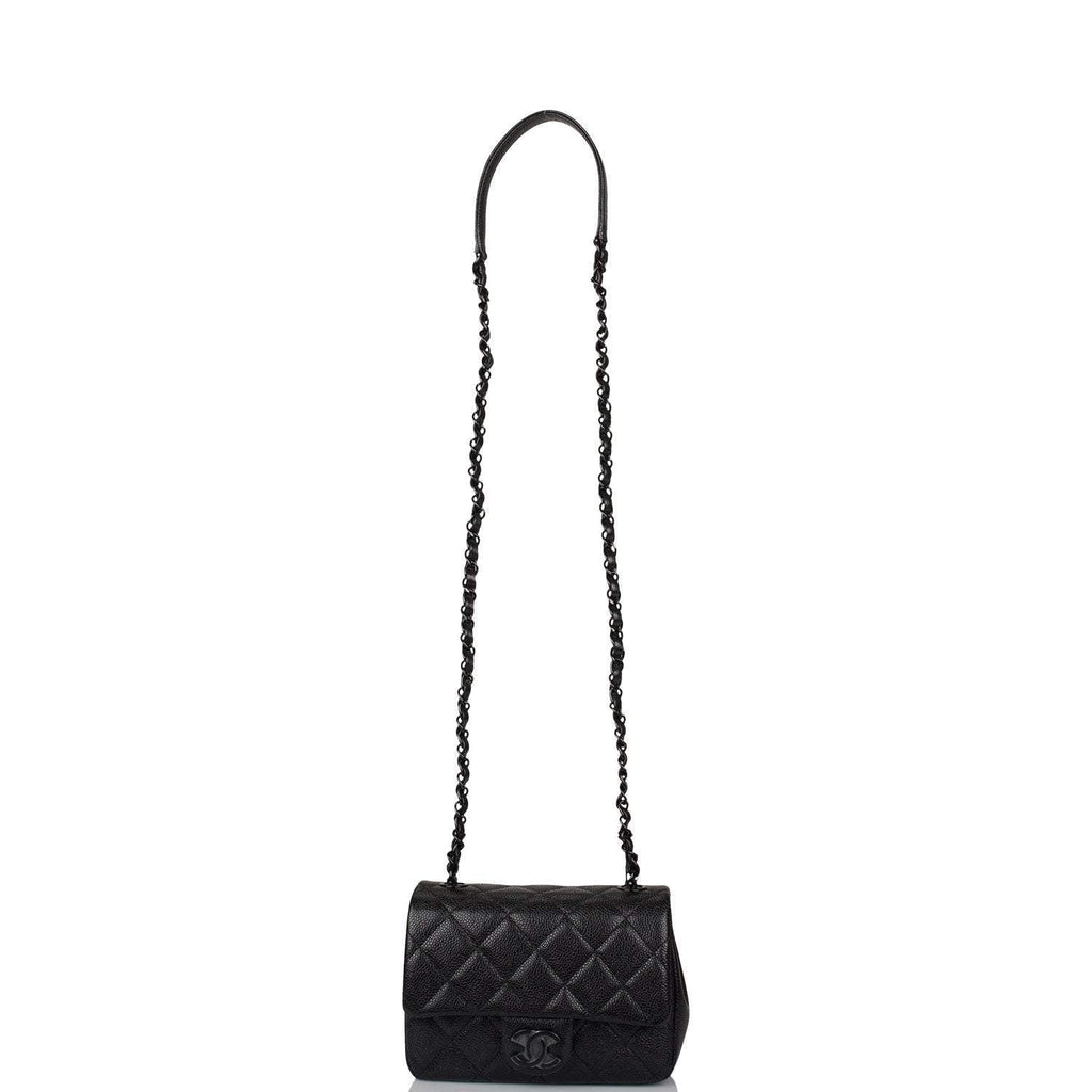 This Incognito Mini Square flap bag is in black caviar with black hardware and has a front flap with signature CC snap closure and single interwoven black leather and black chain link shoulder/crossbody strap.