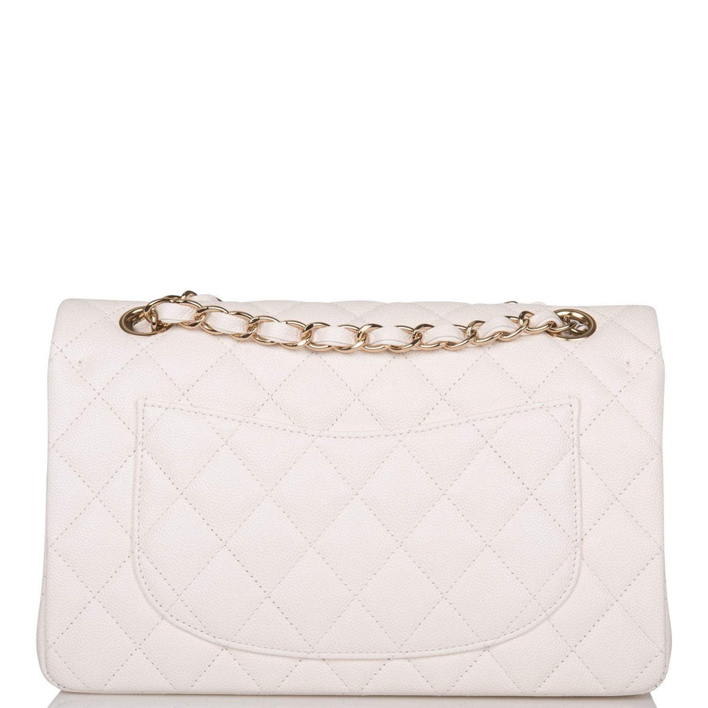 This Small Classic Double Flap bag is in white caviar leather with light gold tone hardware and features a front flap with signature CC turnlock closure, half moon back pocket, and adjustable interwoven light gold tone...