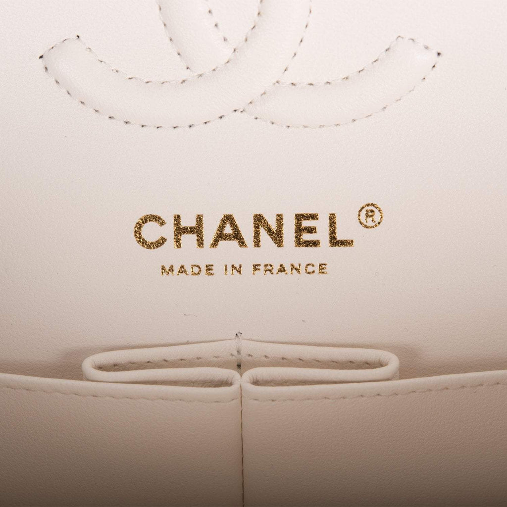 This Small Classic Double Flap bag is in white caviar leather with light gold tone hardware and features a front flap with signature CC turnlock closure, half moon back pocket, and adjustable interwoven light gold tone chain link and white leather shoulder strap.