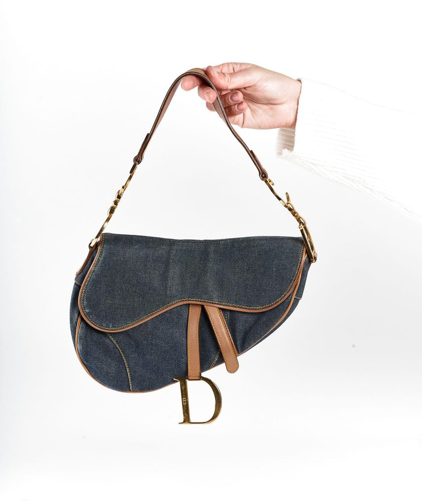 We are so in love with this vintage Christian Dior saddle bag. This Dior saddle bag is crafted from blue denim canvas with beige leather lining and finished with gold hardware. It features an asymmetric style with the iconic Dior D buckle featured dangling on the front.