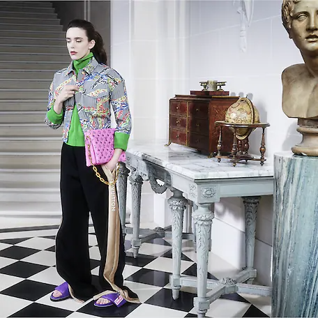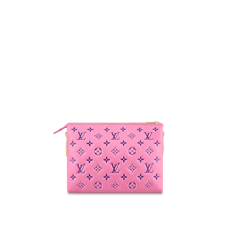 Fashioned from puffy lambskin and accessorized with a chunky gold-color chain, this Coussin PM handbag is part of the Vuittamins capsule collection. Its bright vibrant colorway is Nicolas Ghesquière’s translation of the joy and audacity of women. The Coussin can be worn cross-body with the strap, as a chain baguette, or carried under the arm.