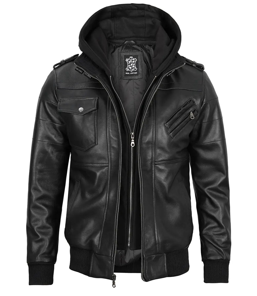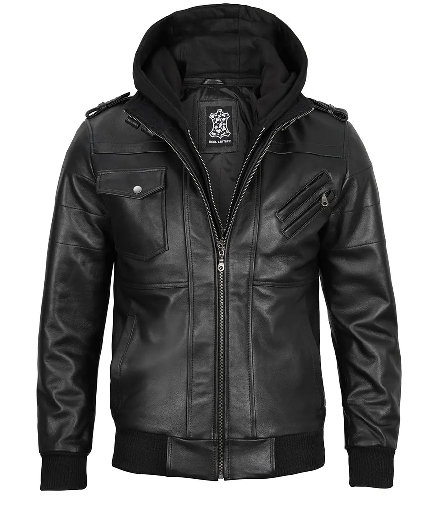 - Tall Men's Black Leather Jacket with Removable Hood