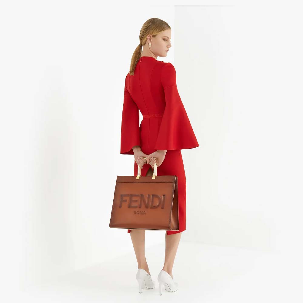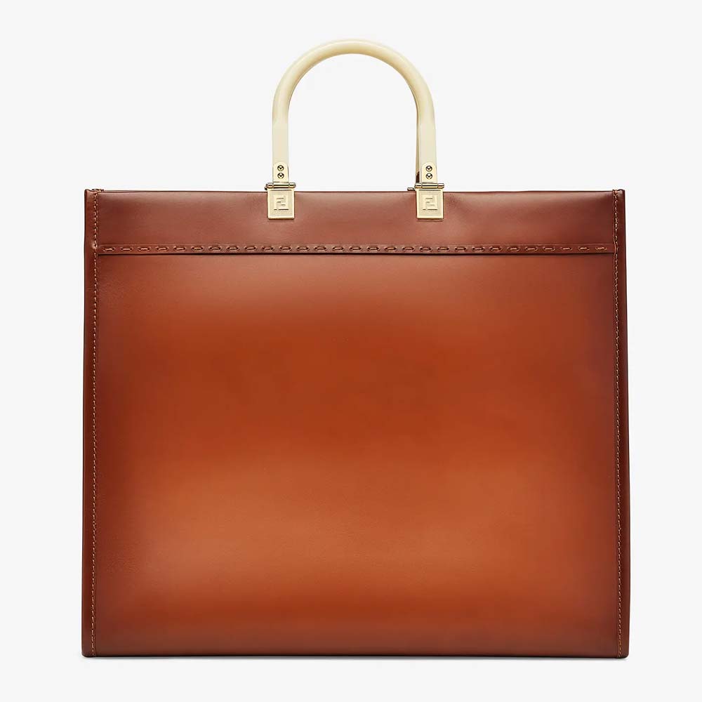Sunshine Shopper bag made of leather elegantly hand-decorated in graduated shades of brown, with hot-stamped “FENDI ROMA” and stiff white plexiglass handles.