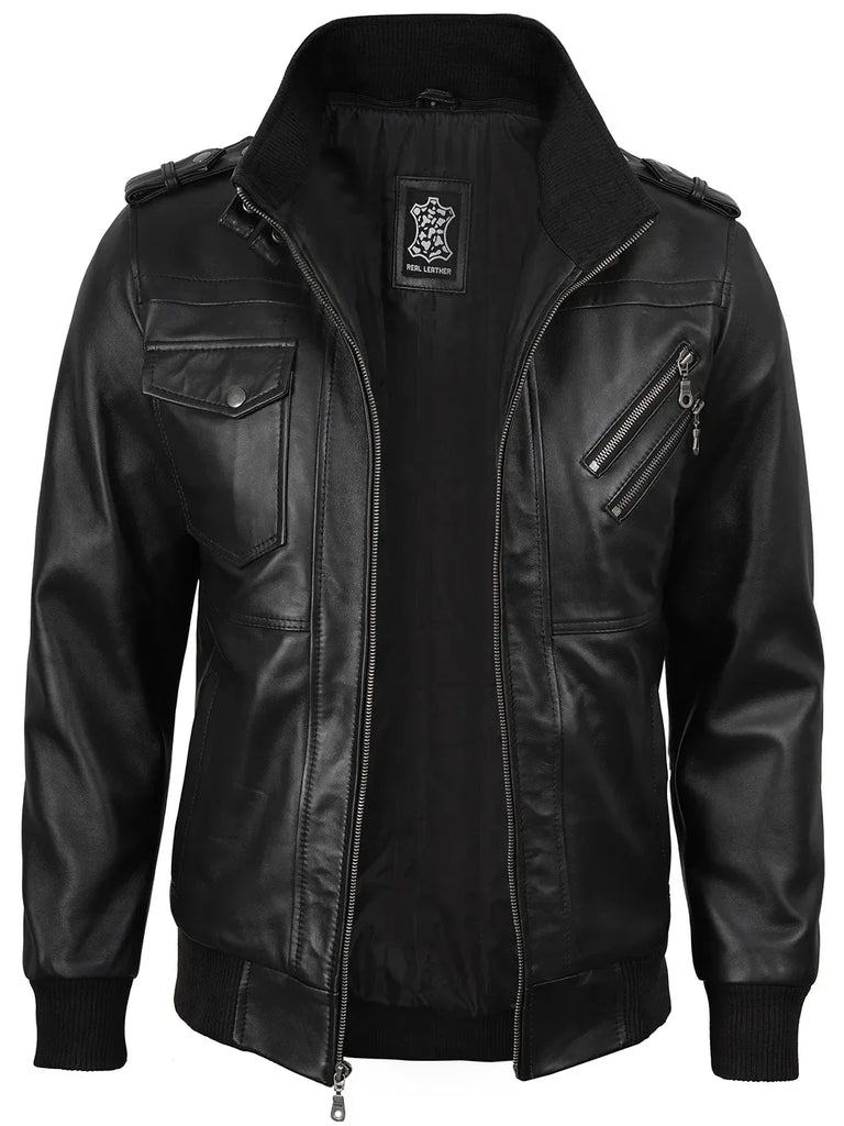 - Men's Black Bomber Leather Jacket with Removable Hood
