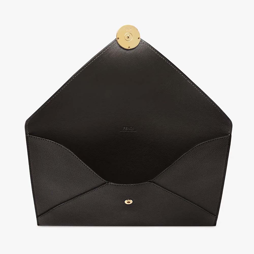 F is Fendi large slim pouch with geometric flap. Press stud fastening. Made of black tumbled Cruise leather. Gold-finish metalware.