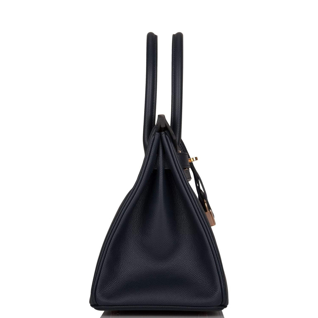This Birkin is in Bleu Indigo epsom leather with rose gold hardware and has tonal stitching, front flap, two straps with center toggle closure, clochette with lock and two keys, and double rolled handles.