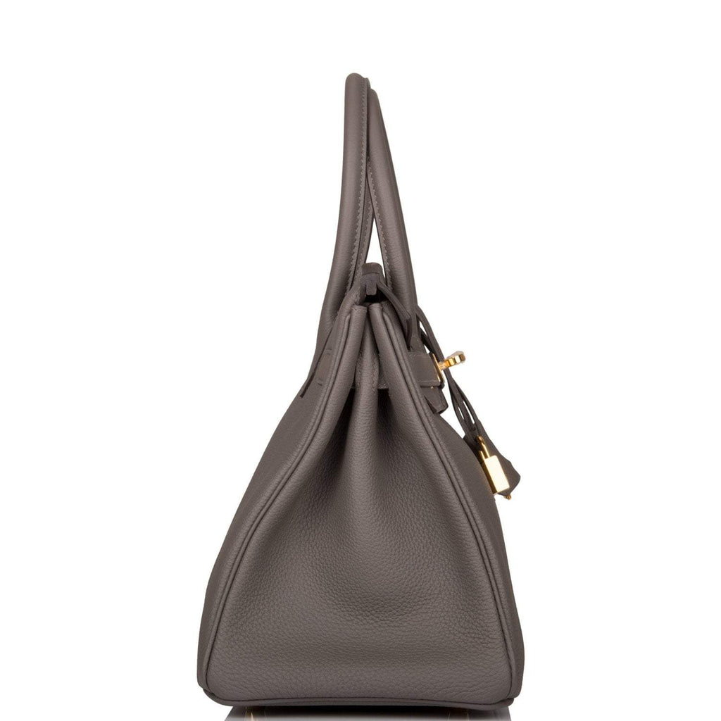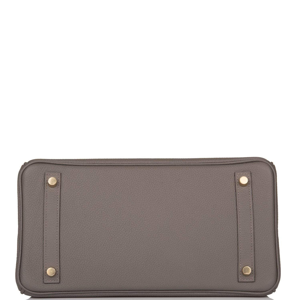 This Birkin is in Etain togo leather with gold hardware and has tonal stitching, front flap, two straps with center toggle closure, clochette with lock and two keys, and double rolled handles.