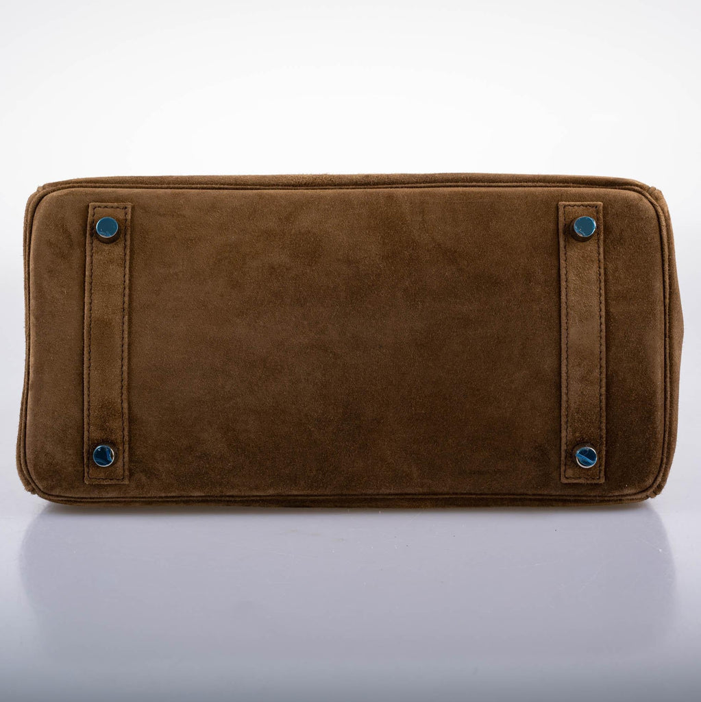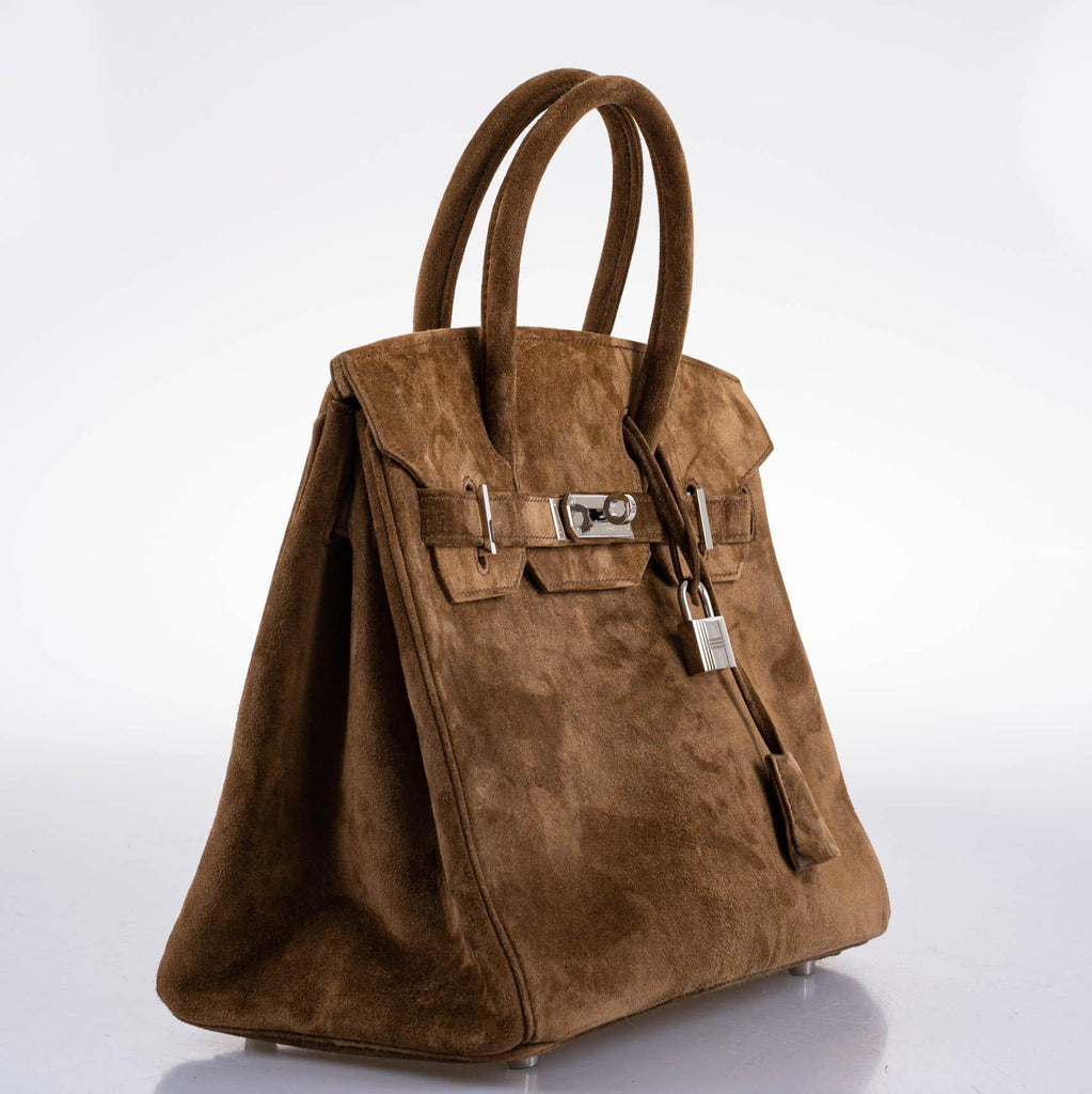 Some Birkins are rare on a level that goes far and beyond the rest. This super collectible grail bag is a 30cm Birkin made of a very unusual material for Hermes: Suede. Saying suede Birkins are rare is an understatement. They have been produced for as long as any Birkins have, though are more difficult to find than even a Himalayan. Veau Doblis suede as Hermes calls it, is treated as a precious material and given heightened attention towards quality and construction. This extremely rare collectors piece is at once unbelievably unique, and a timeless classic, rendered in one of Hermes’ most enduring neutral shades: Gold - the stunning neutral classic staple shade reimagined here in precious suede. It has been kept in Pristine condition with the plastic intact on the Palladium hardware - ready to sit at the top of a world-class collection.