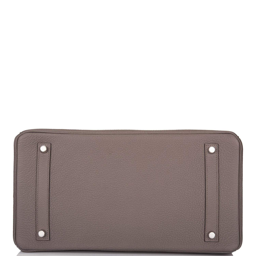 This Birkin is in Etain togo leather with palladium hardware and has tonal stitching, front flap, two straps with center toggle closure, clochette with lock and two keys, and double rolled handles.