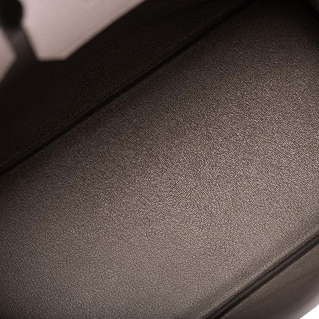 The interior is lined with Etain chevre and has one zip pocket with an Hermes engraved zipper pull and an open pocket on the opposite side.