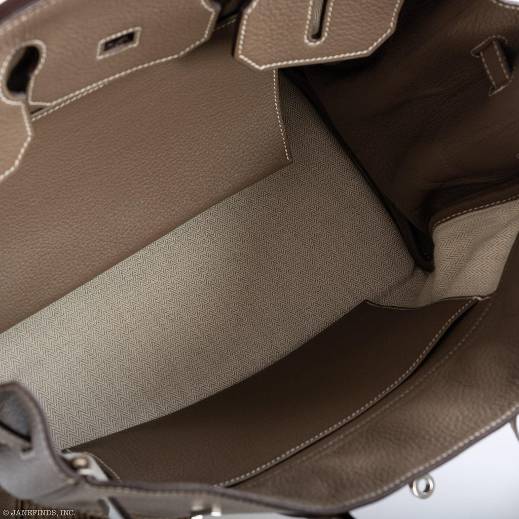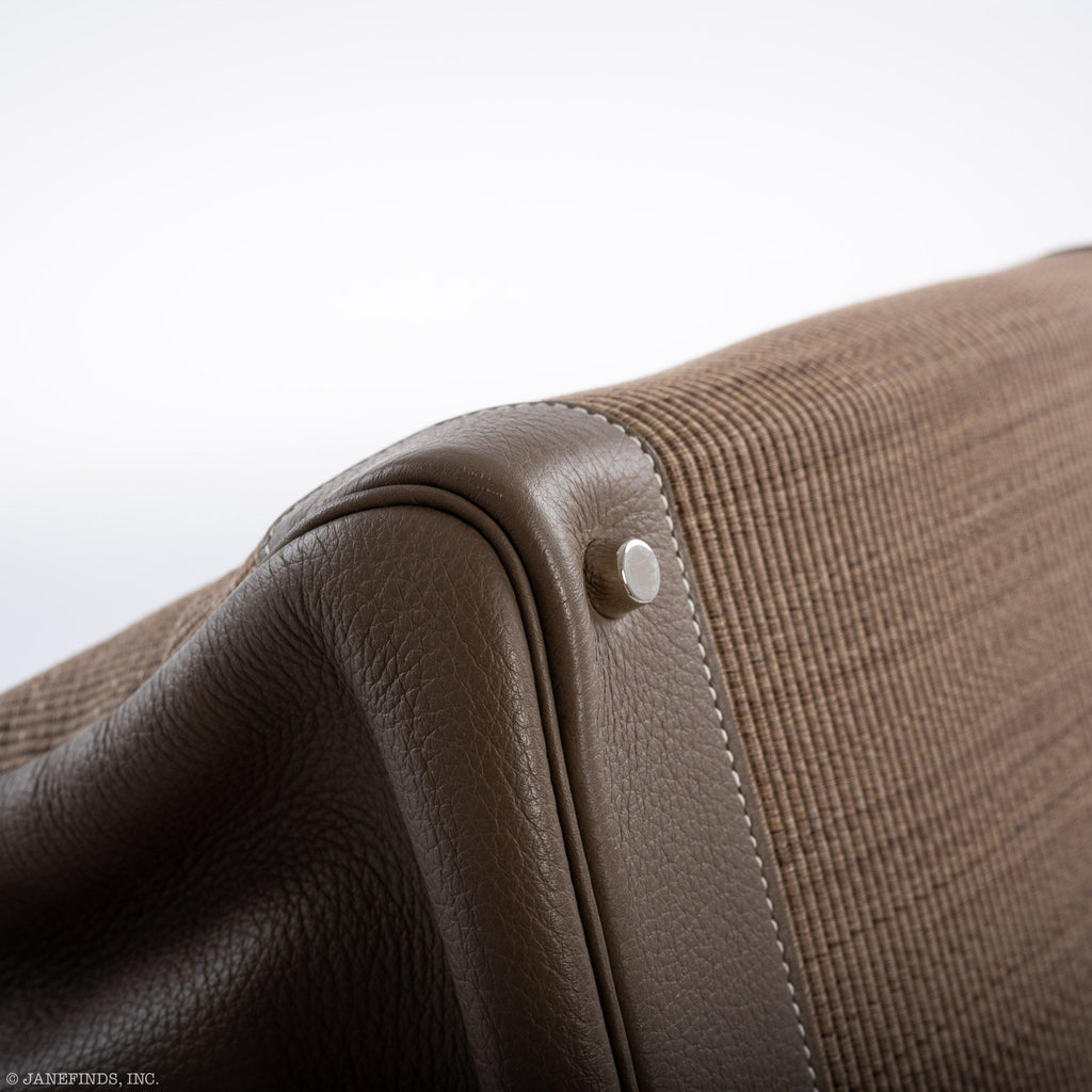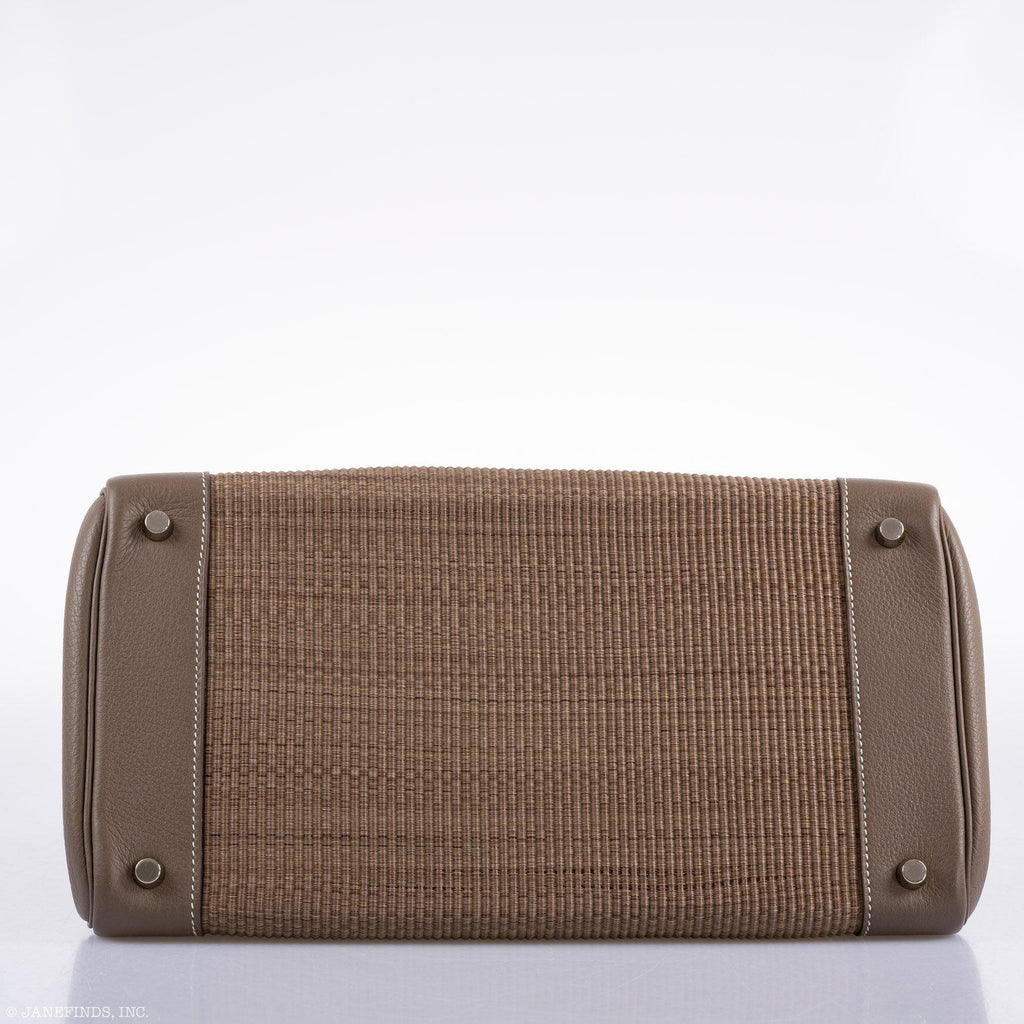 Intricately woven from natural horse-hair, the body of this Birkin displays a lovely pattern of neutral hues that weave together and form this hard-to-find vintage material known as Crinoline. Discontinued over a decade ago, this style of woven hairs from a horse’s tail is paired here in a 35cm Birkin with Etoupe Clemence leather and Palladium hardware, making for an Hermes bag even more deeply rooted in equestrian heritage than most. Carefully maintained, this bag is a deep-cut from the archives of vintage Birkins, an unusual piece that becomes rarer and rarer each year.