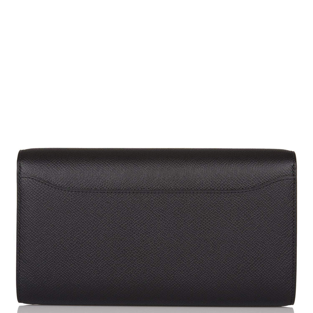 This Constance Wallet To Go is in Black epsom leather with rose gold hardware and has tonal stitching, metal "H" snap lock closure, open front compartment and removable crossbody strap.