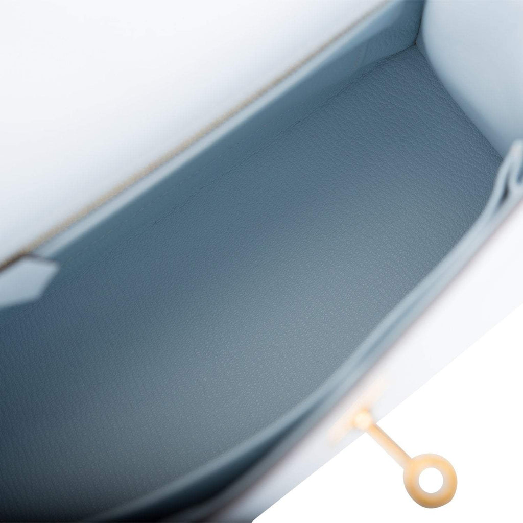 This Kelly, in the Sellier style, is in Bleu Brume epsom leather with gold hardware and has tonal stitching, two straps with front toggle closure, clochette with lock and two keys, single rolled handle and removable shoulder strap.