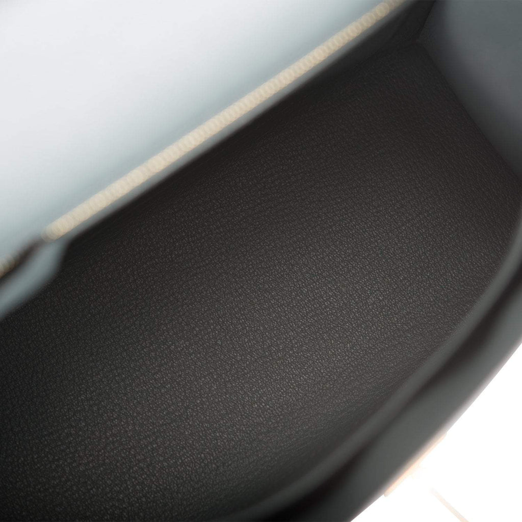 The interior is lined with Bleu Orage chevre leather and has one zip pocket with an Hermes engraved pull and one open pocket on the opposite side.