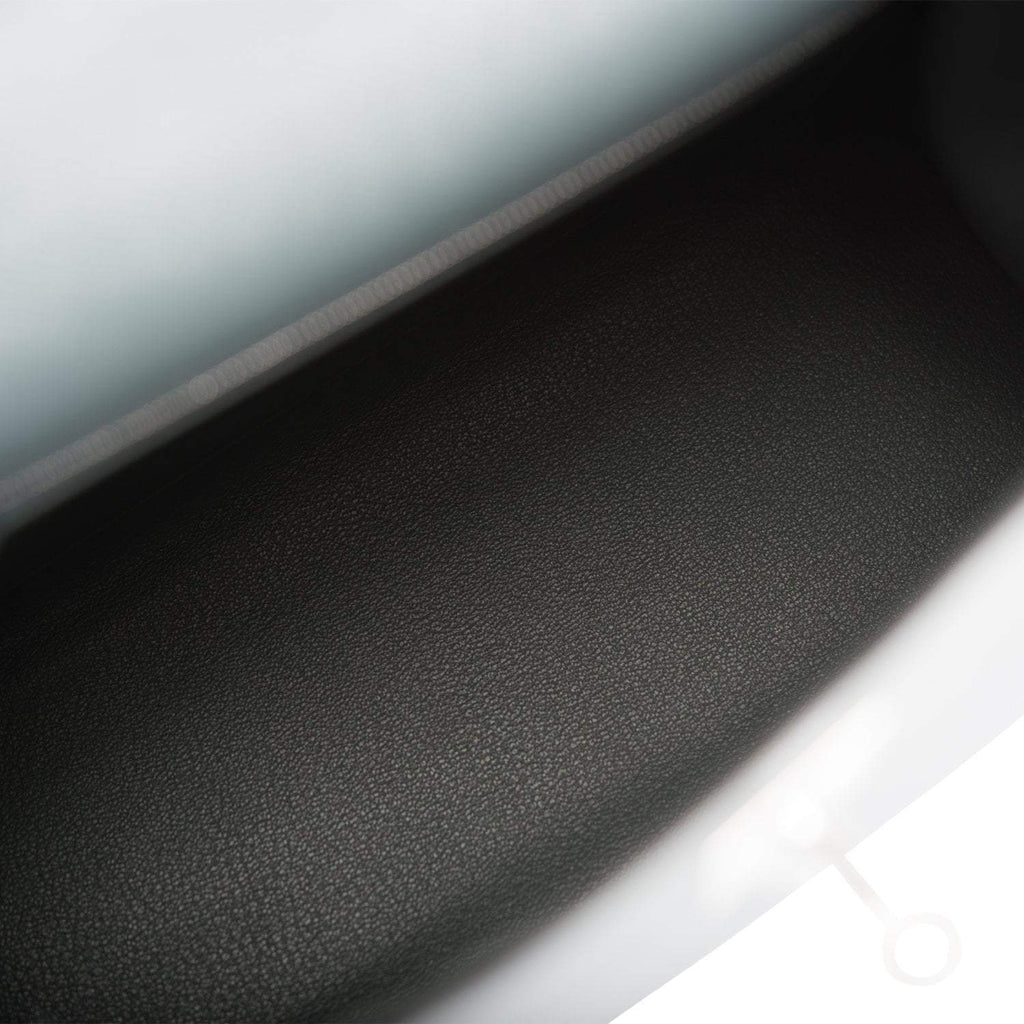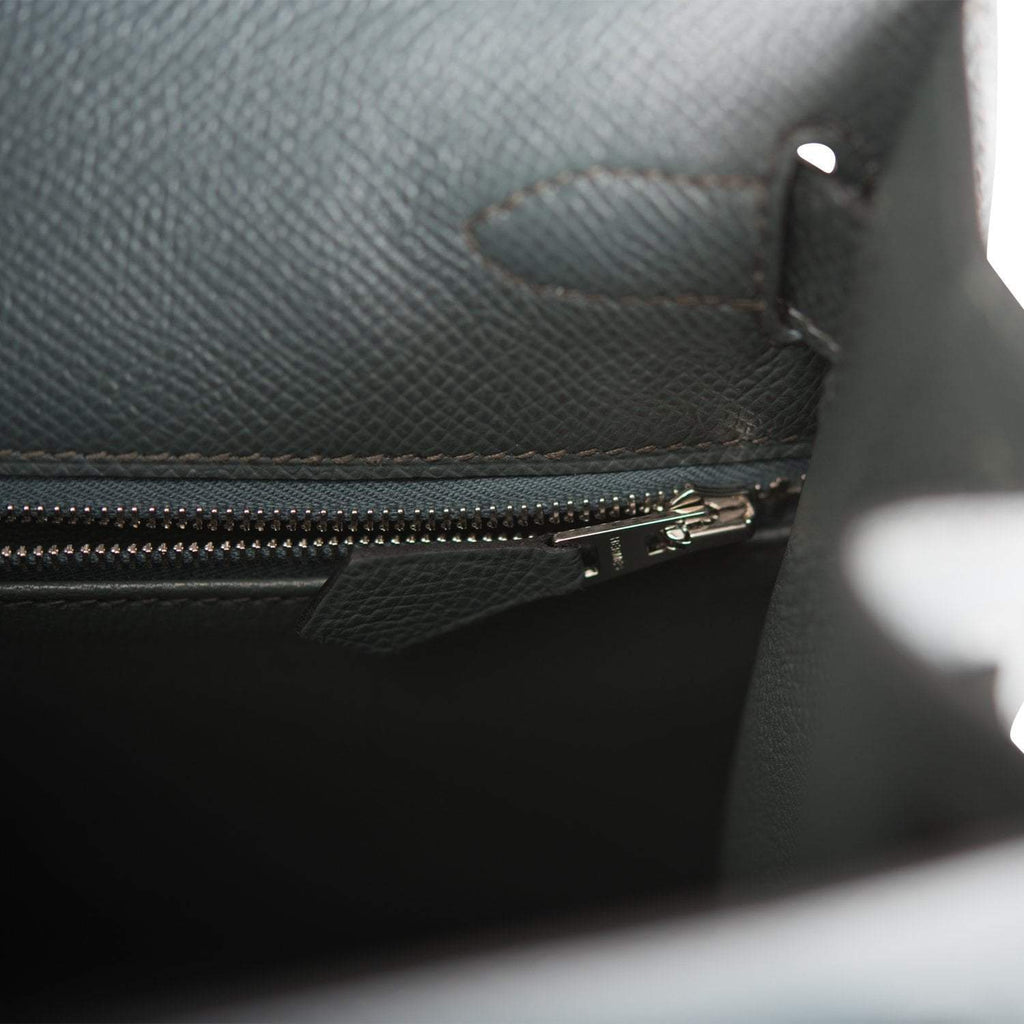 The interior is lined with Bleu Orage chevre leather and has one zip pocket with an Hermes engraved pull and two open pockets on the opposite side.