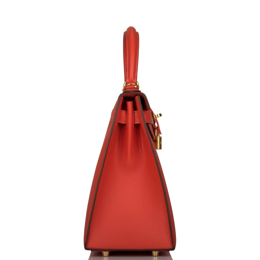 This Kelly, in the Sellier style, is in Capucine epsom leather with gold hardware and has tonal stitching, two straps with front toggle closure, clochette with lock and two keys, single rolled handle and removable shoulder strap.