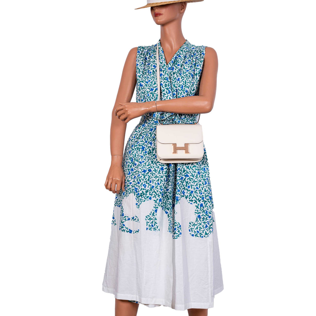 One of Hermes’ newest color, Nata, which is Portuguese for ‘cream’ is a unique neutral in the brand’s cannon. Warmer than Beton, lighter than Parchment, brighter than Craie, Nata brings the spectrum of white out into the sun. Used here in Swift leather as an 18cm Constance, the color is highlighted even more so by the warm Rose Gold hardware, another new addition from Hermes, which makes this bag particularly special. This Constance is perfect for wearing crossbody during the day, or doubling the strap to wear over the shoulder at night.