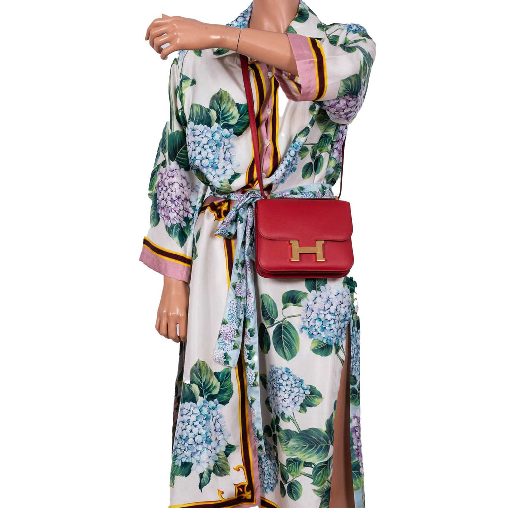 The Hermes Constance bag was first designed by Catherine Chaillet in 1959 and was given the name in honor of her fifth child, Constance, having delivered the baby the same day that the first Constance left the Hermes production store. With its leather shoulder strap allowing the bag to hang freely, it soon became the favorite former First Lady of the United States, Jacqueline Kennedy who popularized the Constance amongst Hollywood’s elite. While Hermes is known for their incredible colors, their selection of reds alone spans numerous shades - this example is Rouge Casaque with gold hardware. Kept in Excellent condition by a discerning collector.