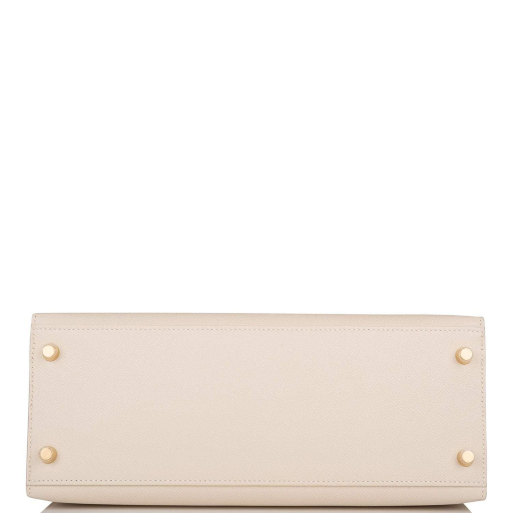 This Kelly, in the Sellier style, is in Craie epsom leather with gold hardware and has tonal stitching, two straps with front toggle closure, clochette with lock and two keys, single rolled handle and removable shoulder strap.
