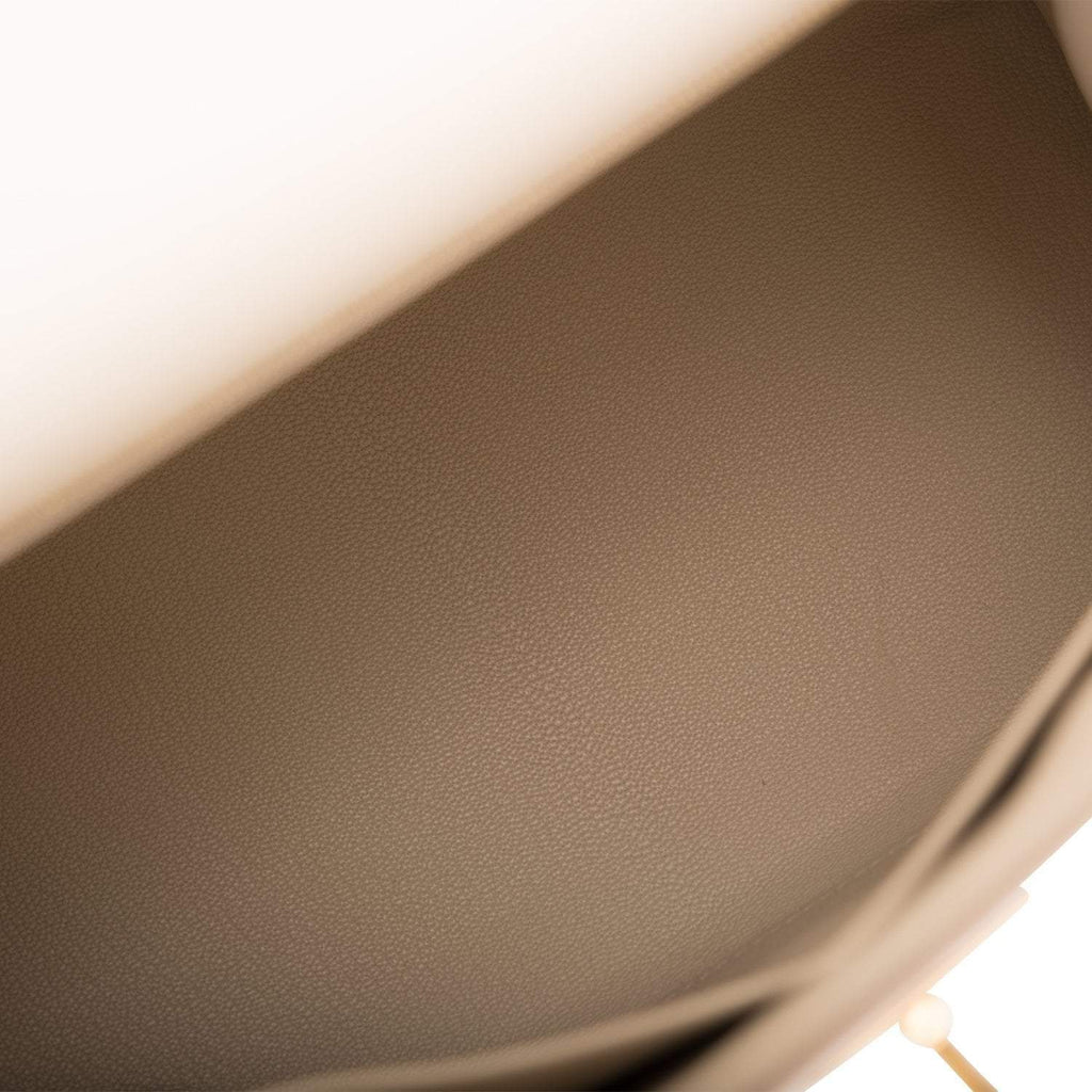 The interior is lined with Craie chevre leather and has one zip pocket with an Hermes engraved pull and two open pockets on the opposite side.