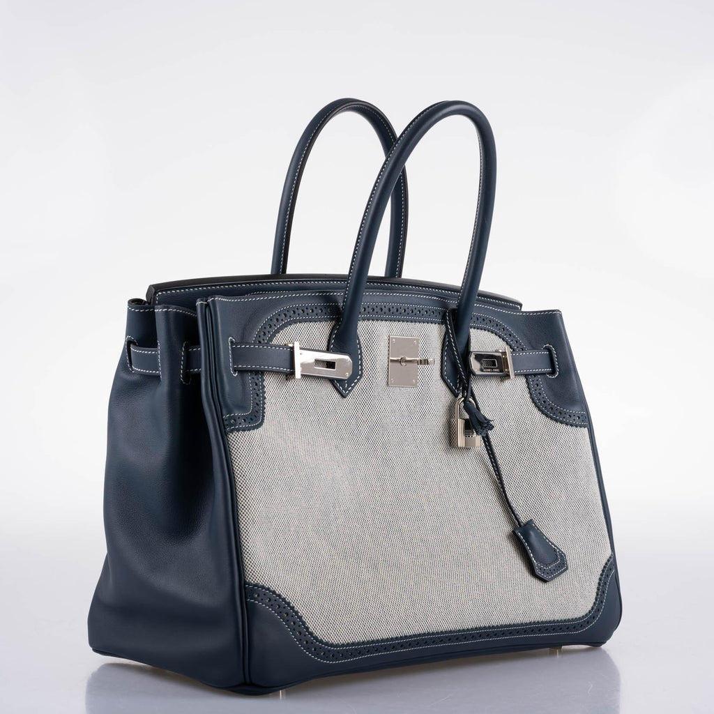 - Hermes Ghillies Birkin 35 Blue de Prusse Swift & Toile with Palladium Hardware - 2014, R Square