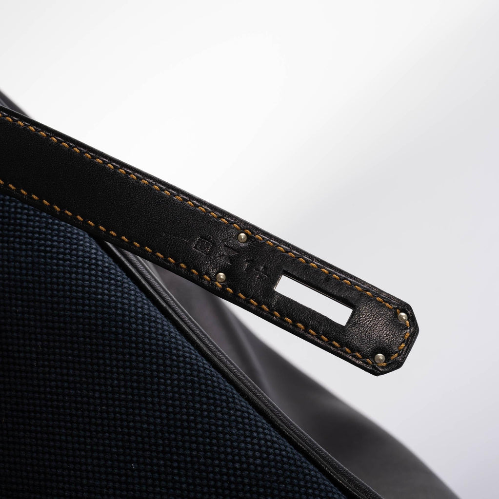 Inspired by the punched leatherwork of iconic Irish Ghillie shoes, Hermes launched the Ghillies line in 2012. The distinct pattern frames the bodies of these bags, which have been produced in numerous variations. This is the only 40cm version of a Ghillies Birkin ever produced. Featuring an indigo denim canvas body and Black Evercalf framing, the bag is made further special by its brushed Palladium hardware. A style that works well for both men and women, this sophisticated combination of black and blue is difficult to pull off, yet Hermes has stuck the landing.